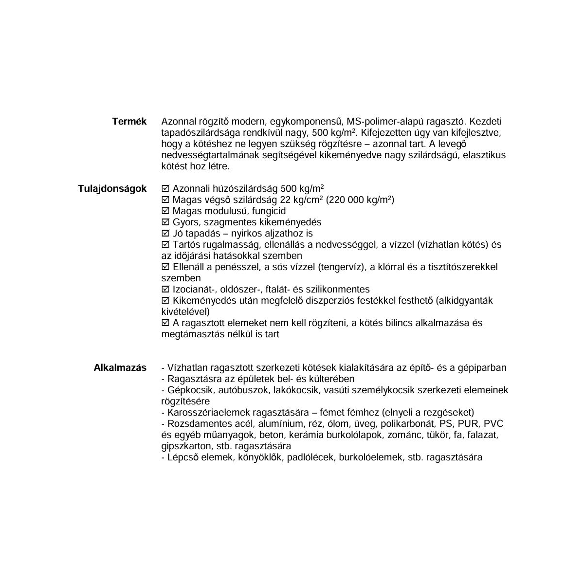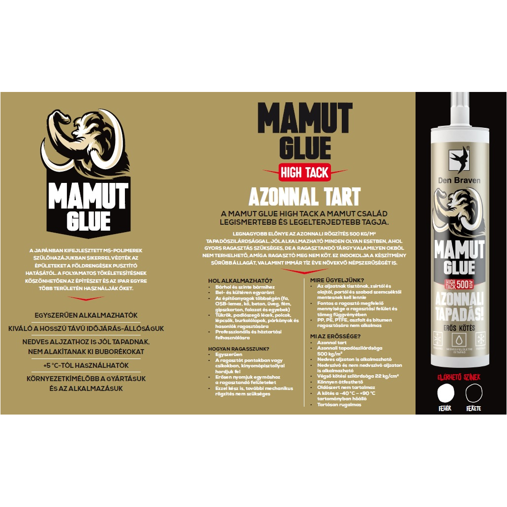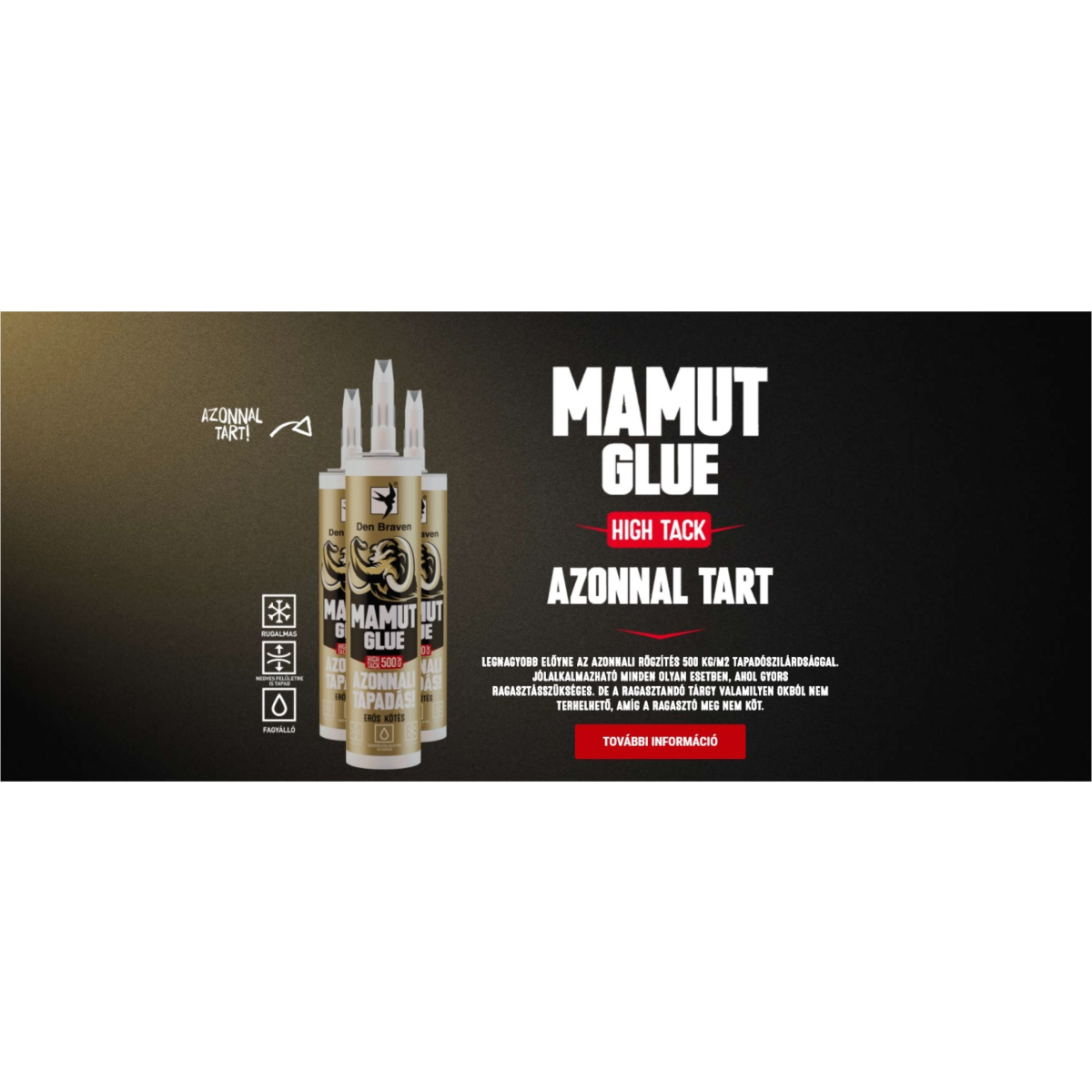 Zwaluw Mammut ragasztó 290 ml-es kiszerelésben, fehér színben, egykomponensű. MS polimer alapú ragasztóanyag, magas kezdeti tapadóerő, szilikon- és izocianát-mentes. Legnagyobb előnye az azonnali rögzítés 500 kg/m2 tapadószilárdsággal. Jól alkalmazható minden olyan esetben, ahol gyors ragasztás szükséges, de a ragasztandó tárgy valamilyen okból nem terhelhető, amíg a ragasztó meg nem köt. Ez indokolja a készítmény sűrűbb állagát, valamint immár tíz éve növekvő népszerűségét is.