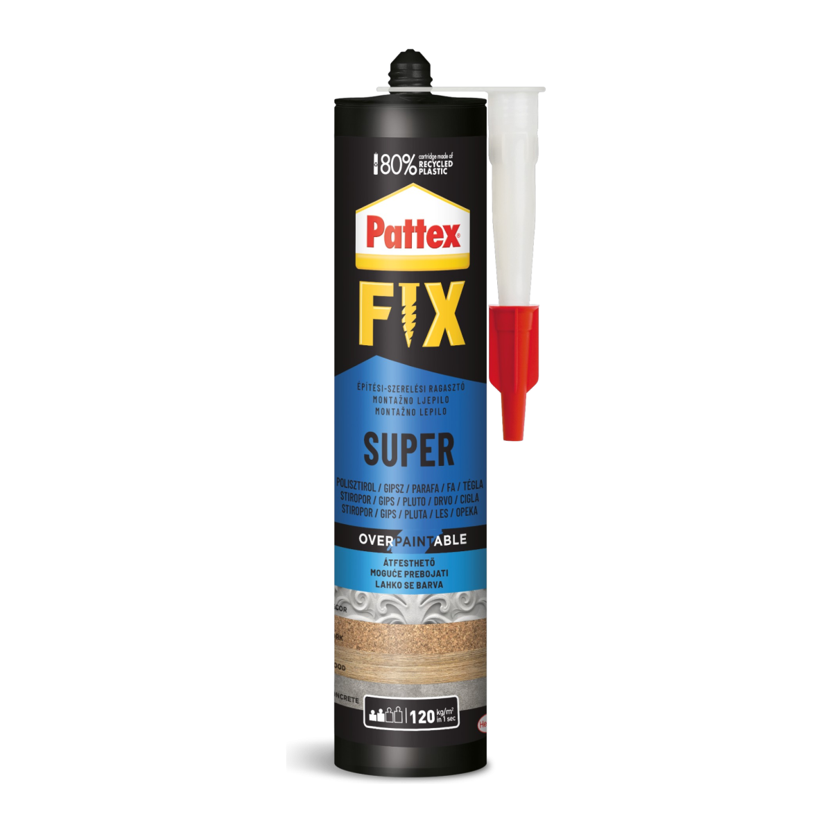 A Pattex FIX Super oldószermentes vizes bázisú műanyag diszperzióból készült univerzális ragasztó. Tökéletes kisebb súlyú tárgyak beltéri ragasztására. Öregedés-, időjárás- és nedvességálló. A ragasztás 20°C és +70°C között hőmérsékletálló. Nagy szilárdságú, univerzális ragasztó. Kül-, és beltéri alkalmazásnál egyaránt helyettesíti a csavarokat, szöget, tipliket. A ragasztó alkalmas habosított polisztirolból (pl. Nikecell), fából, fémből, PVC-ből, kerámiából, faforgácslemezből, gipszkartonból, parafából, gipszből és hasonló anyagokból készült: pl. polisztirolból készült szigetelő lemezek, dekoritlemezek, díszlécek, díszítőprofilok, fapanelek, stb., fa ajtótokok, homlokzat profilok, falécek, névtáblák, hangszigetelő lapok, PVC-ből készült szellőző- és kábelcsatornák, rostokkal erősített cementlapok, gipszlapok, farostlemezek, kerámiacsempék felragasztására. Polietilén, polipropilén és teflon ragasztására NEM alkalmas!