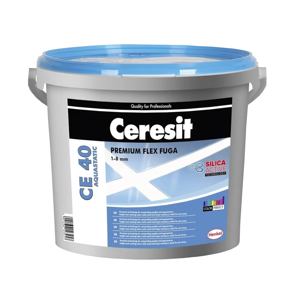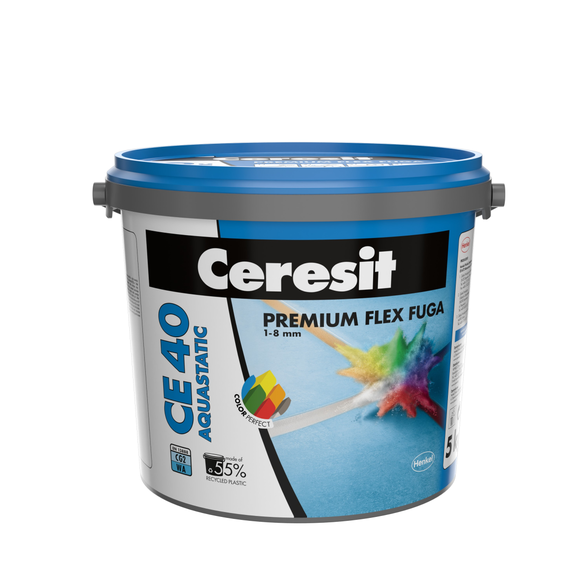 Ceresit CE 40 Aquastatic fugázó, 5 kg-os kiszerelésben. Kerámia-, üveg-, kő- (kivéve az elszíneződésre hajlamos természetes kőből készült burkolat és márvány), mozaiklapok fugázására. 1-8 mm széles hézagokhoz, függőleges és vízszintes felületeken. Kül- és beltéren is használható. Cementbázisú, flexibilis, vízlepergető, szennyeződéstaszító, gombásodás- és penészálló. Padlófűtés esetén is alkalmazható. Kiválóan tapad. Sima, szennyeződéstaszító felületet ad. Hosszan tartó védőképességét a megemelt hatóanyag fokozatos kibocsátása révén éri el. Alkalmazási hőmérséklet: +5°C-tól +25°C-ig. Kedvezőbb kötésidővel rendelkezik. A pigmentek jól beágyazódnak.