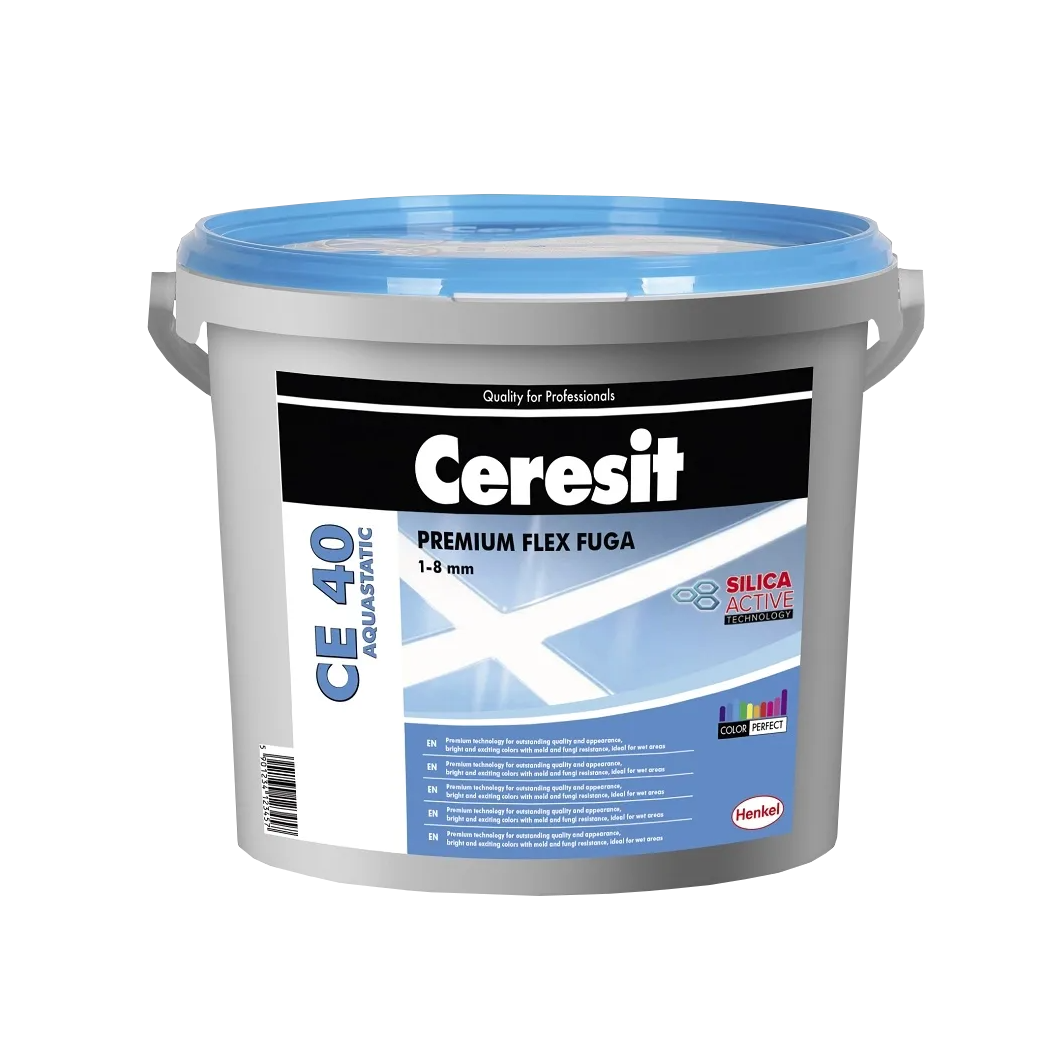 Ceresit CE 40 Aquastatic fugázó, 5 kg-os kiszerelésben. Kerámia-, üveg-, kő- (kivéve az elszíneződésre hajlamos természetes kőből készült burkolat és márvány), mozaiklapok fugázására. 1-8 mm széles hézagokhoz, függőleges és vízszintes felületeken. Kül- és beltéren is használható. Cementbázisú, flexibilis, vízlepergető, szennyeződéstaszító, gombásodás- és penészálló. Padlófűtés esetén is alkalmazható. Kiválóan tapad. Sima, szennyeződéstaszító felületet ad. Hosszan tartó védőképességét a megemelt hatóanyag fokozatos kibocsátása révén éri el. Kedvezőbb kötésidővel rendelkezik. Alkalmazási hőmérséklet: +5°C-tól +25°C-ig. Hőállóság: –30°C-tól +70°C-ig. A pigmentek jól beágyazódnak.