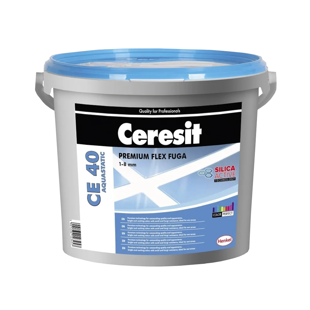 Ceresit CE 40 Aquastatic fugázó, 5 kg-os kiszerelésben. Kerámia-, üveg-, kő- (kivéve az elszíneződésre hajlamos természetes kőből készült burkolat és márvány), mozaiklapok fugázására. 1-8 mm széles hézagokhoz, függőleges és vízszintes felületeken. Kül- és beltéren is használható. Cementbázisú, flexibilis, vízlepergető, szennyeződéstaszító, gombásodás- és penészálló. Padlófűtés esetén is alkalmazható. Kiválóan tapad. Sima, szennyeződéstaszító felületet ad. Alkalmazási hőmérséklet: +5°C-tól +25°C-ig.