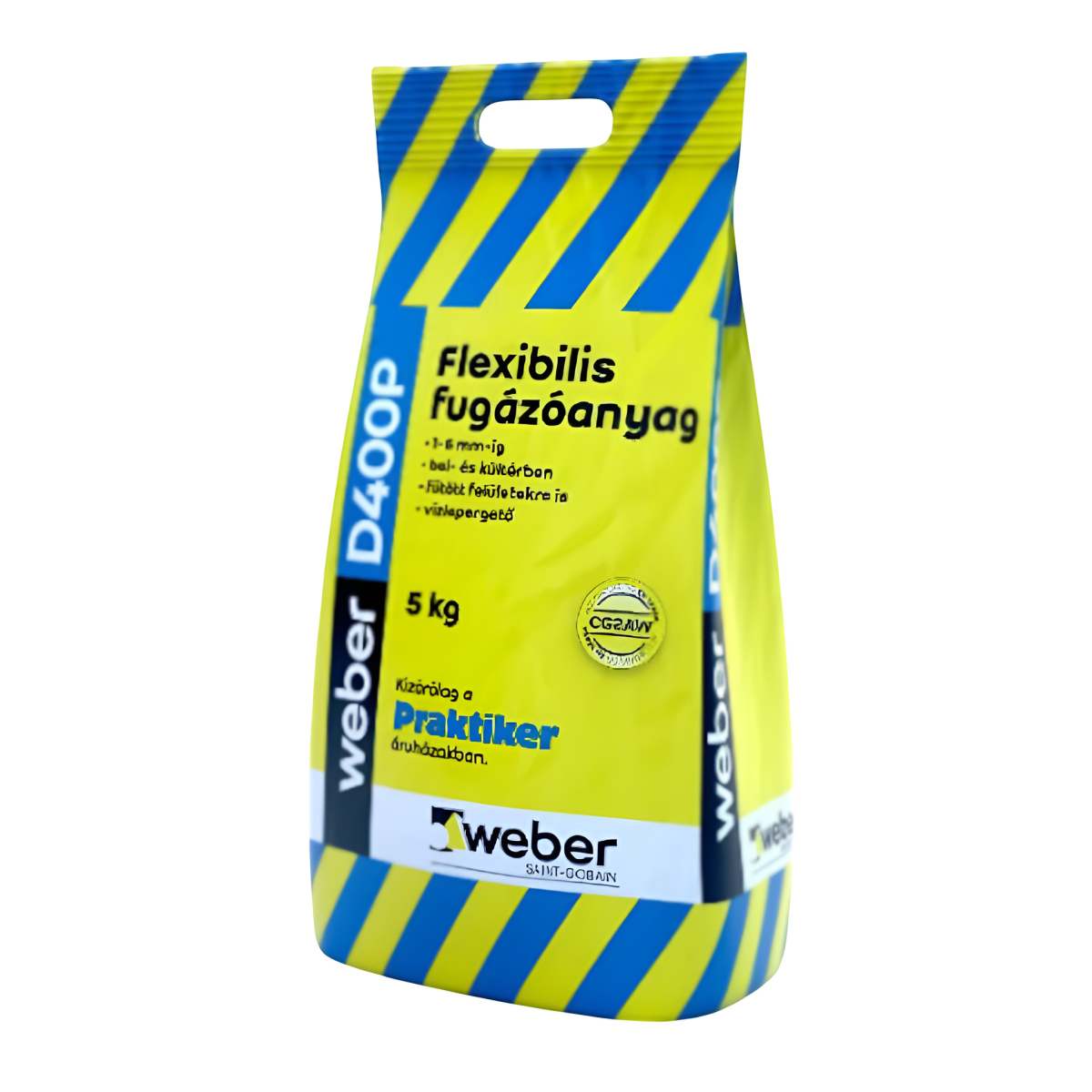 Weber D400P flexibilis fugázóanyag 5 kg-os kiszerelésben. Feldolgozásra kész, cementkötésű, flexibilis fugázóanyag beltéri és kültéri felhasználásra, 6 mm fugaszélességig.