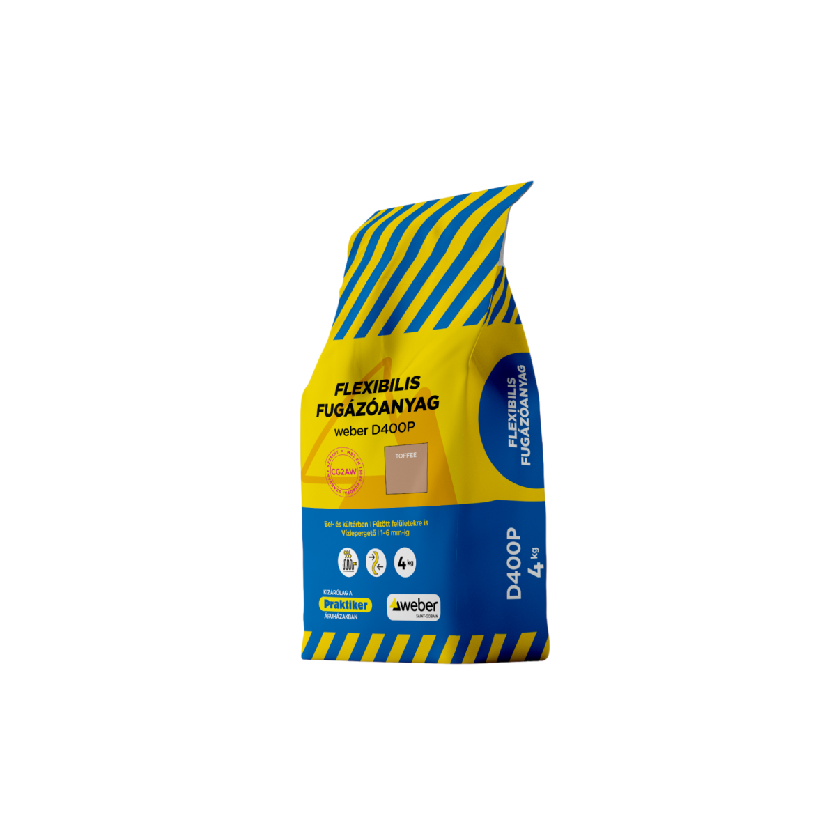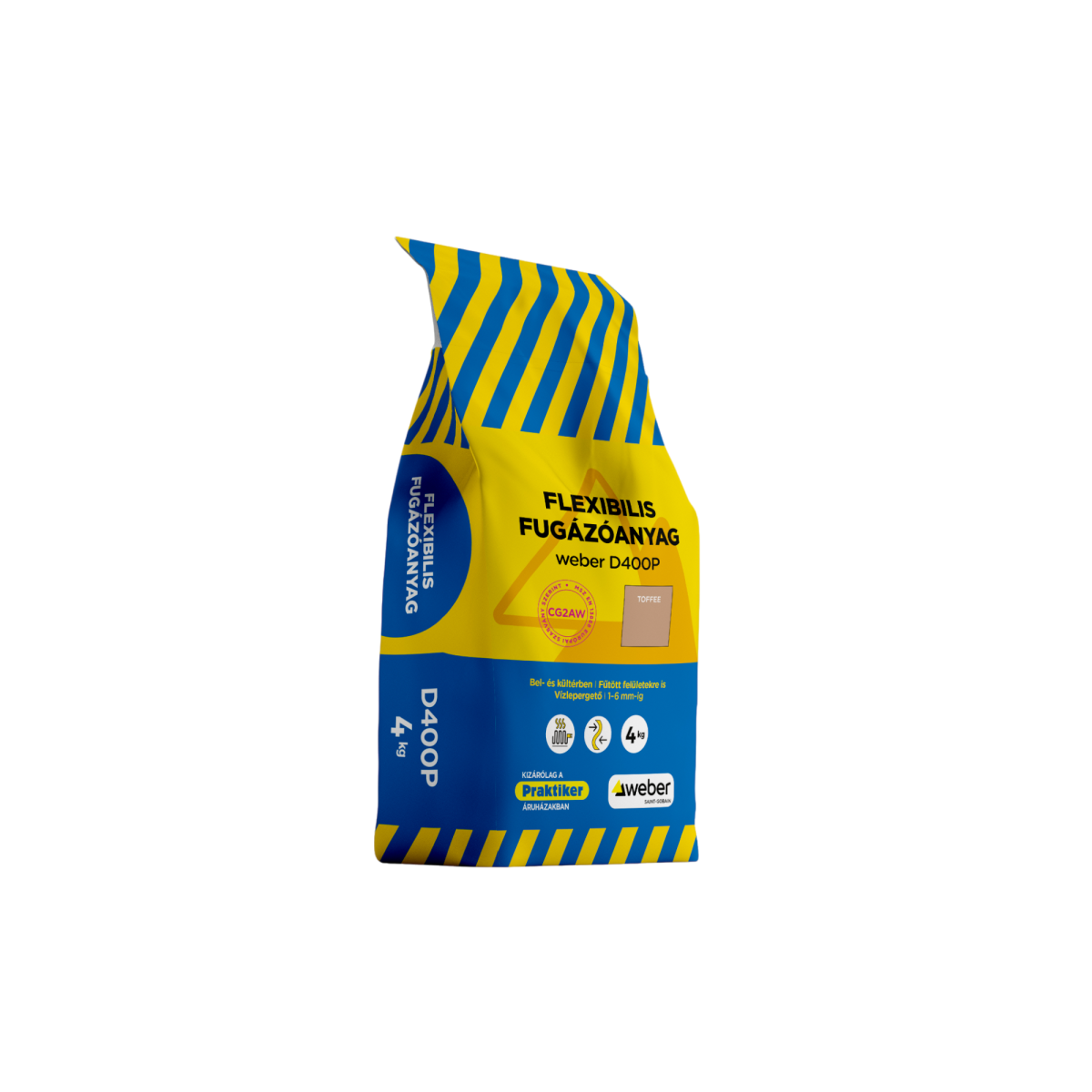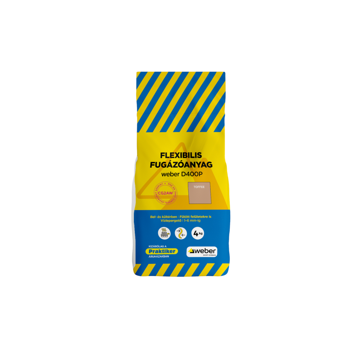 A Weber D400P flexibilis fugázóanyag 4 kg – Toffee feldolgozásra kész, cementkötésű fugázóanyag beltéri és kültéri burkolatokhoz. Rugalmas kialakításának köszönhetően fűtött felületeken is alkalmazható, vízlepergető tulajdonsága pedig hozzájárul a tartós és esztétikus fugaképhez.
