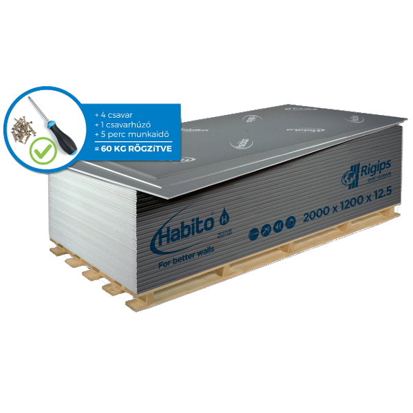 Habito DFRI 12,5 mm terhelhető, ütésálló, tűzgátló építőlemez. Ideális alapanyag Rigips belső falak építéséhez. A Habito építőlemezekkel épült válaszfalak jól bírják a terheket és a terhelést. Rövidebb építési idő, rugalmas térkialakítás, nehéz tárgyak rögzítése könnyedén. A berendezési tárgyak, mint például polcok, lapos képernyők és szekrények válaszfalhoz történő rögzítése nagyon egyszerű. Impregnált, fürdőszobában is használható. A Habito rendszerhez megvásárolható további termékek: HartFix csavar, cikkszám: 314997, 315000, Vario hézagológipsz, cikkszám: 315001, Üvegszálas hézagerősítő szalag, cikkszám: 315017, Aquabead élvédő cikkszám: 314988.