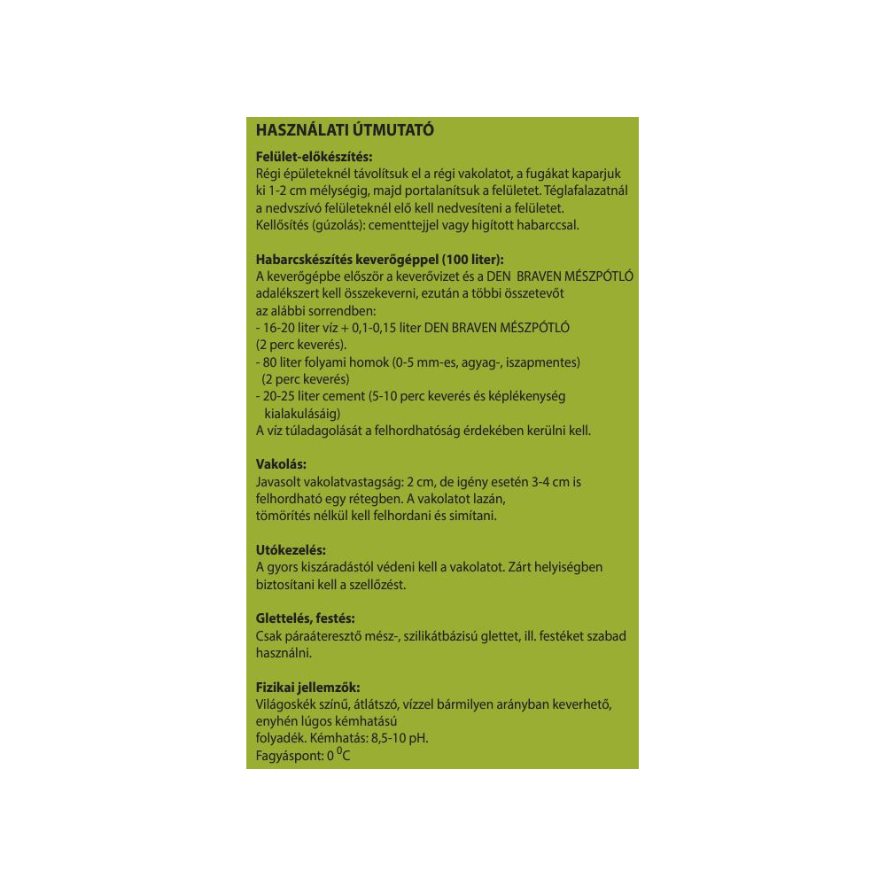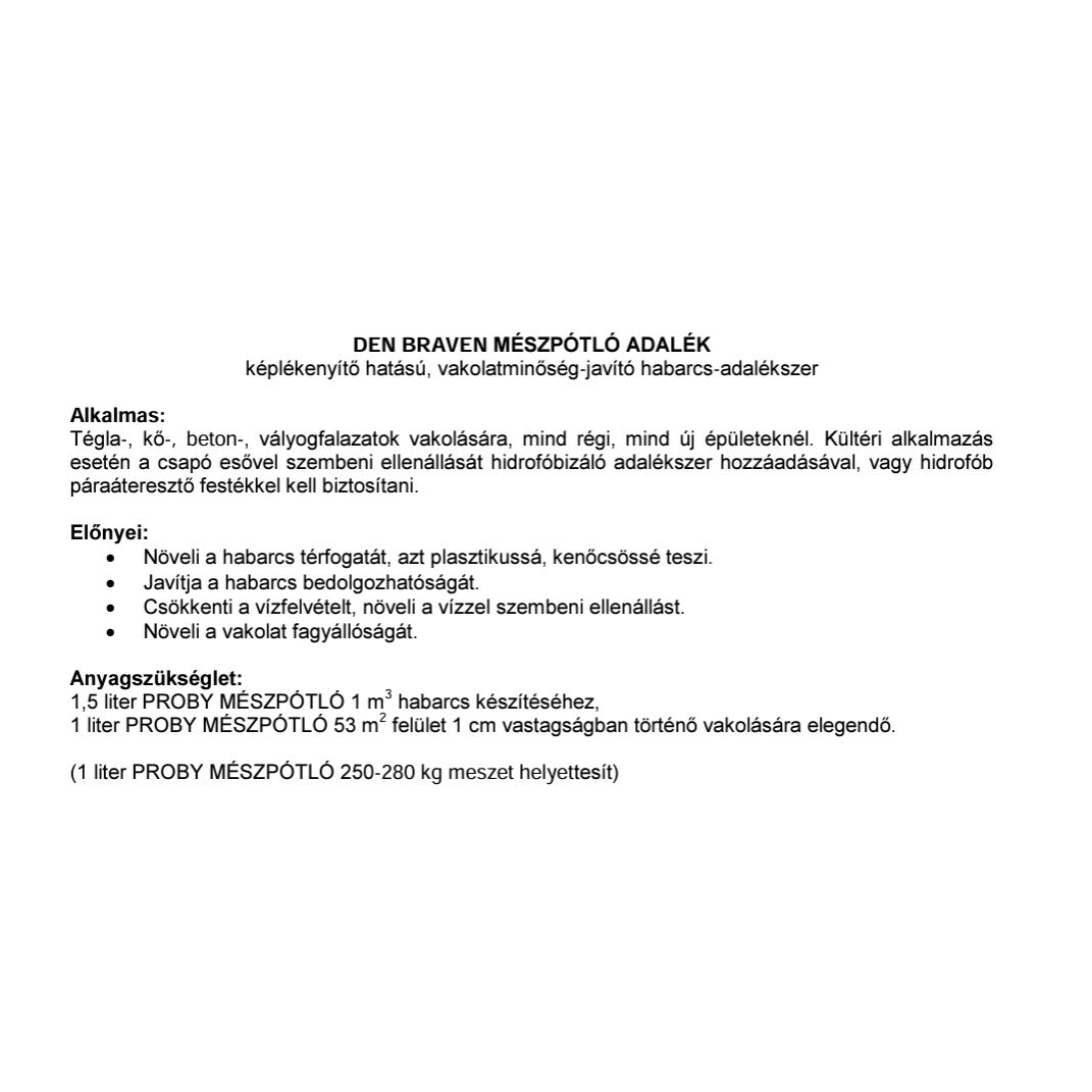 Proby mészpótló 1 literes kiszerelésben. Képlékenyítő hatású, vakolatminőség-javító habarcsadalékszer. Tégla-, kő-, beton-, vályogfalazatok vakolására alkalmas. Növeli a habarcs térfogatát, plasztikussá, kenőcsössé teszi. Javítja a habarcs bedolgozását. Csökkenti a vízfelvételt, növeli a vízzel szembeni ellenállást. Növeli a vakolat fagyállóságát. Kültéri alkalmazás esetén a csapó esővel szembeni védelmet hidrofóbizáló adalékszer hozzáadásával, vagy hidrofób páraáteresztő festékkel kell biztosítani.