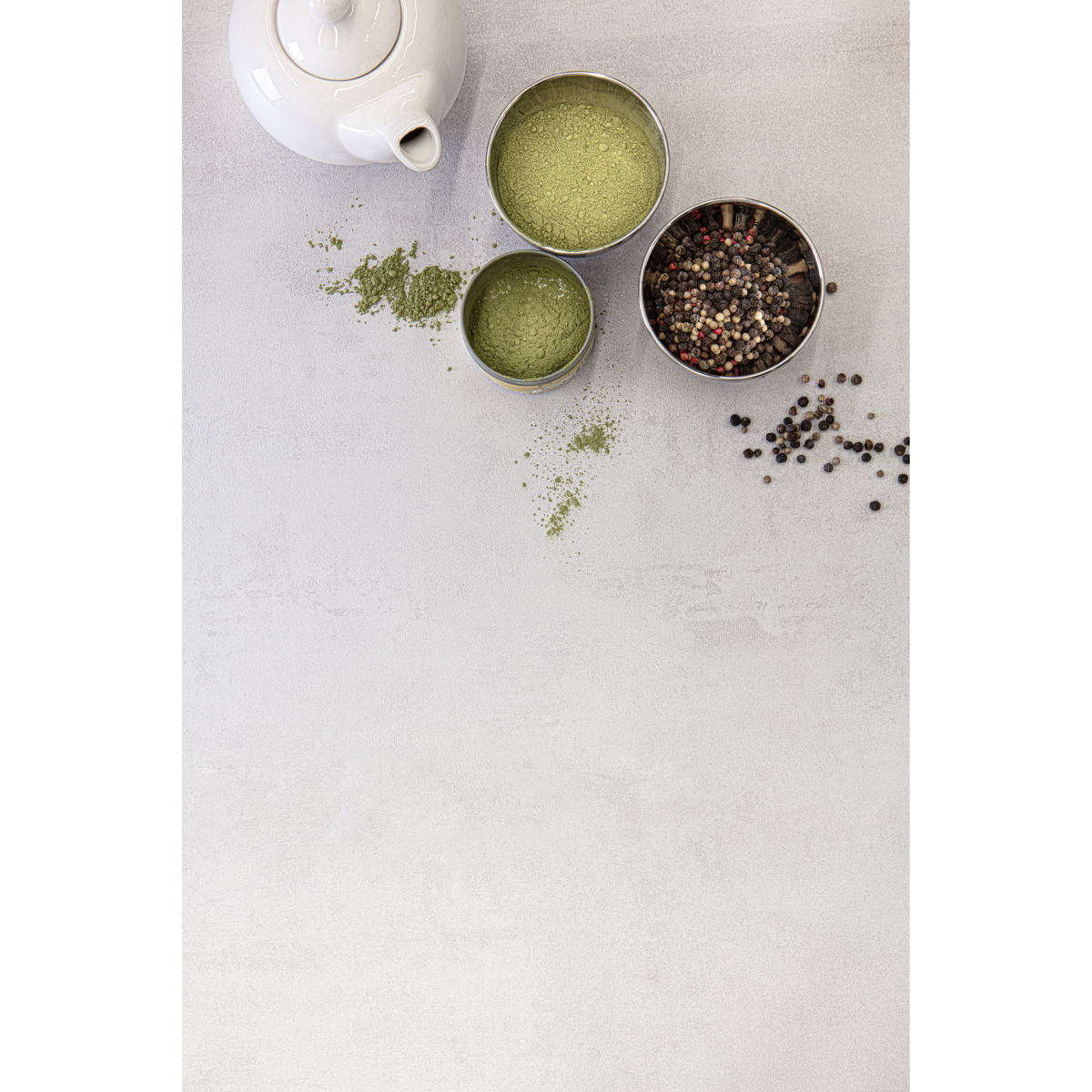 Világos színárnyalatú, betonhatású konyhai munkalap, elegáns és modern megjelenést kölcsönöz a konyhának. Kopás- és fényálló, így hosszú ideig megőrzi exkluzív küllemét. Foltálló, ellenáll a háztartási vegyi anyagoknak. Konyhai munkalapként történő használat mellett sokoldalúan alkalmazható, például irodákban és hobbihelyiségekben bútorgyártás felhasználásra.