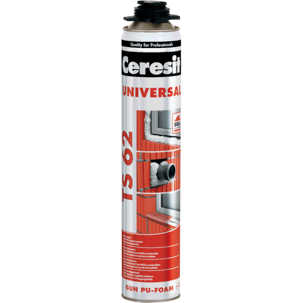 Ceresit TS 62 pisztolyos purhab - 750 ml - egykomponensű poliuretán tömítőhab - nyílászárók beépítéséhez és réskitöltéshez - felhasználható: +5°C feletti hômérsékleten - sűrűség: 2030 kg/m3 - bőrképződés: kb. 1018 perc - kötési idő: kb. 1 óra - teljes terhelhetőség: maximum 24 óra