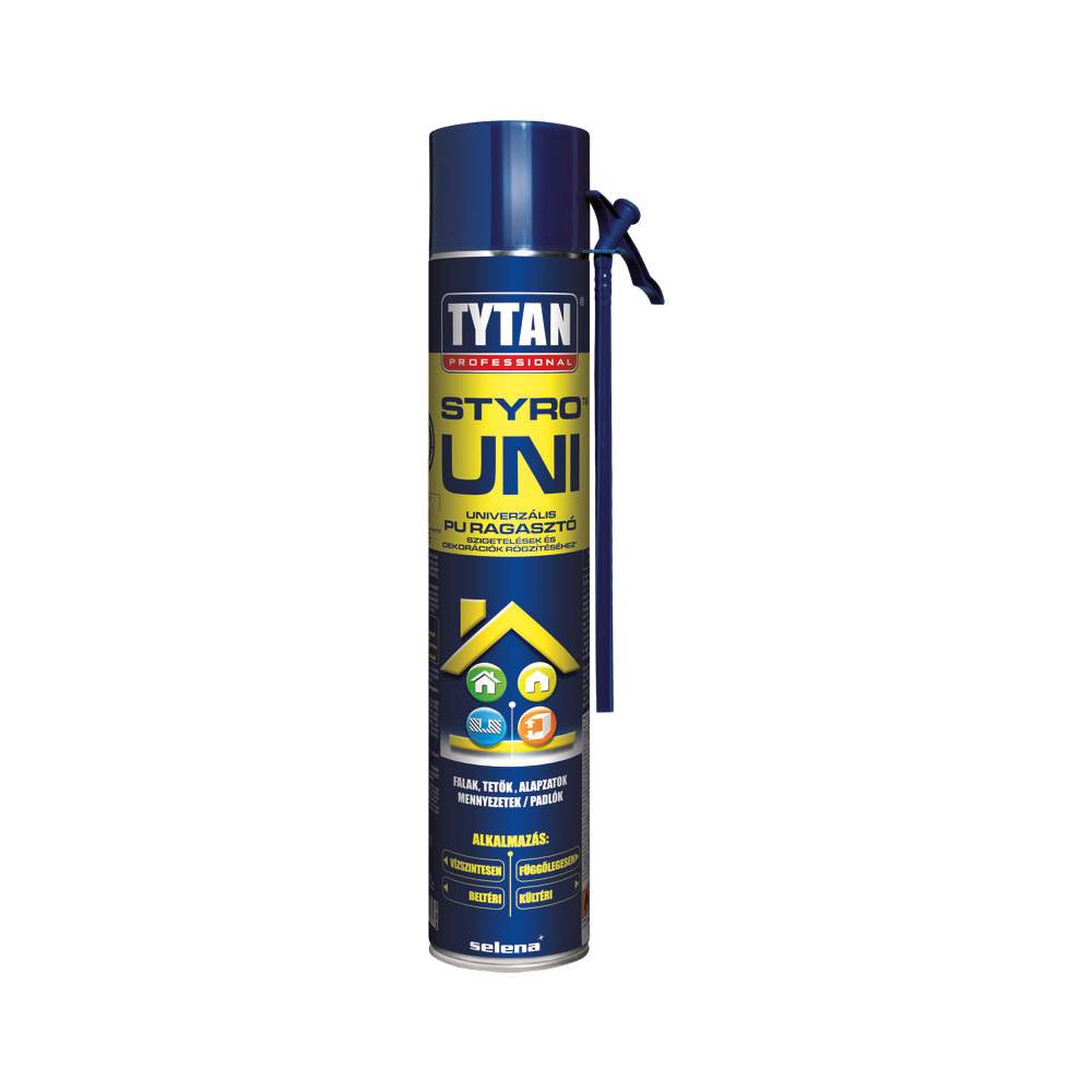 Tytan Styro Uni PU kézi ragasztó 750 ml kiszerelésben, kék színben. Szigetelőelemek, dekorációs táblák rögzítéséhez, javításához, ragasztásához- alkalmazható gipszkarton lapokon, paneleken, falak szigetelő tábláin, homlokzatokon, alapzatokon, tetőkön (EPS, XPS, PIR, PUR) stb. Vízszintes és függőleges felületeken, kül- és beltérben egyaránt felhasználható. Felhasználási hőmérséklet: +5-30°C. Maximális nyitott idő: 5 perc. Maximális korrigálhatóság: 15 perc. Teljes kikeményedés: 24 óra