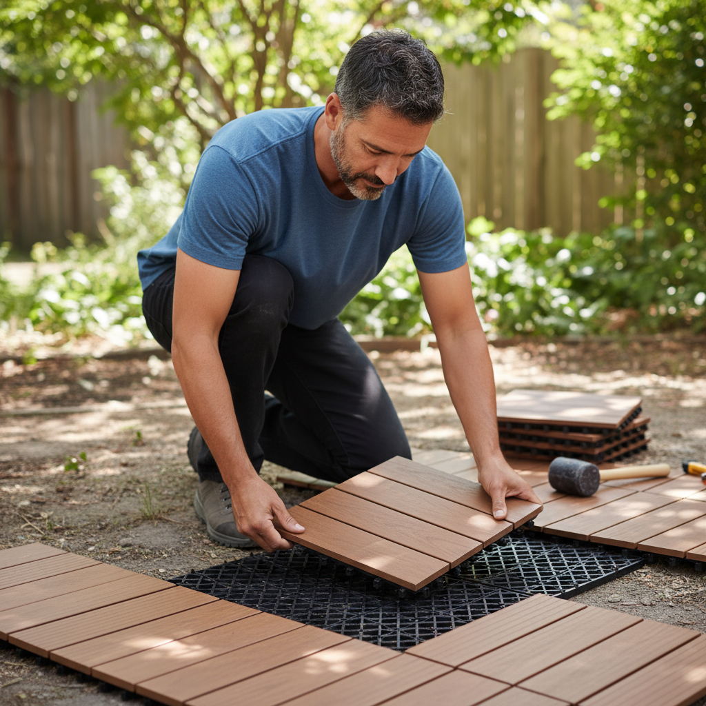 WPC fa színű járólap, mérete: 30X30 cm, teljes vastagság: 2,2 cm, műanyag alap vastagsága: 1,2 cm. 4 db/ csomag kiszerelésben értékesítjük.