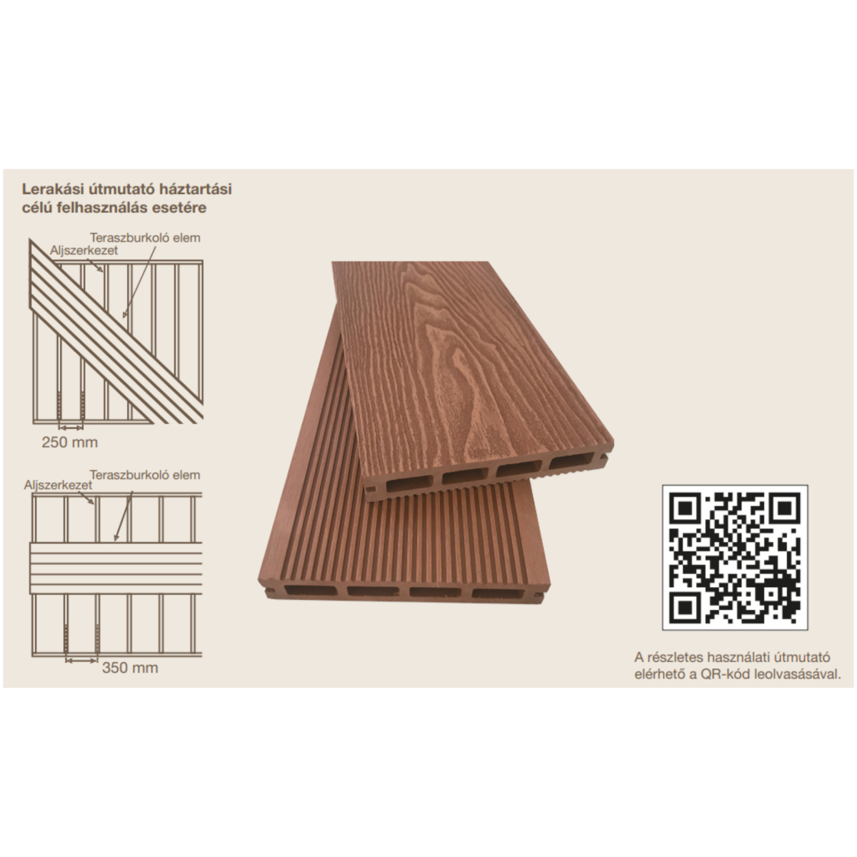 Ez a 2 méter hosszú, fa színű WPC kültéri burkolóelem ideális választás teraszok, erkélyek és egyéb kültéri felületek esztétikus és tartós burkolásához. A fa–műanyag kompozit (WPC) anyag a természetes fa megjelenését ötvözi a műanyag ellenálló képességével, így kültéri környezetben is hosszú távon stabil megoldást biztosít.