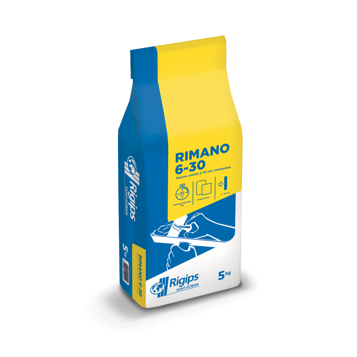 Rigips Rimano 6-30 gipszes vakolat - 5 kg - gipsz kötőanyagú kézi vakolat - lakóépületek, középületek, ipari objektumok belső beton és stabil falazott szerkezeteinek vakolására, beleértve a szokásos páratartalmú helyiségeket, lakóházak konyháit és fürdőszobáit - kizárólag beltéri felhasználásra - 6-30 mm vastagságig - repedés- és zsugorodásmentesen szárad - 1 cm vastagságtól festhető és csempézhető - anyagszükséglet: 0,8 kg/m2/mm - bedolgozhatósági idő: 60 perc