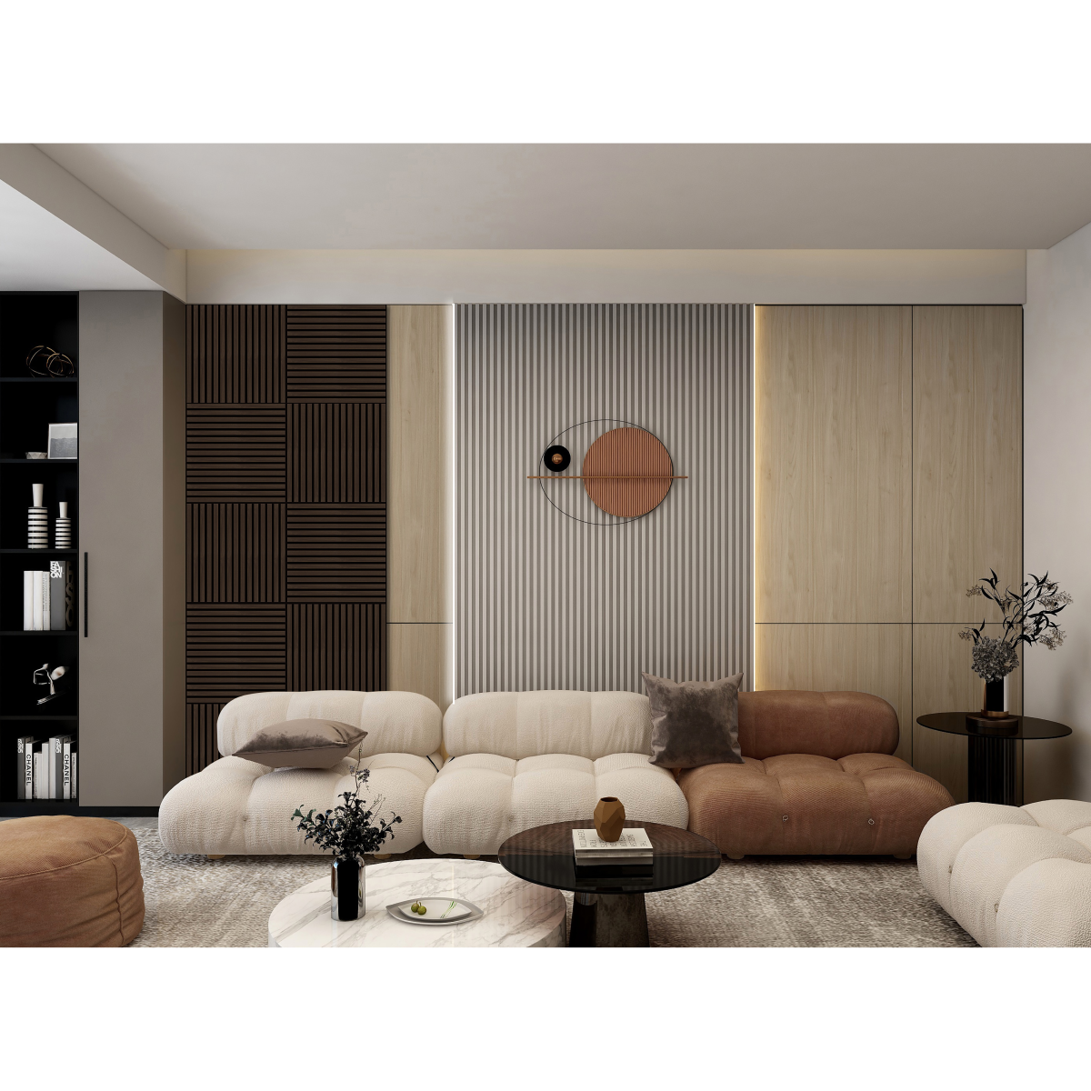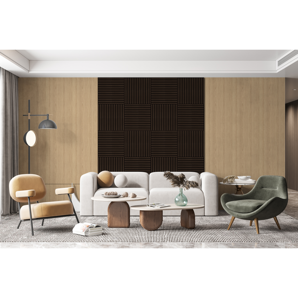 A 60×60 cm méretű akusztikus falipanel hatékony megoldás otthoni vagy irodai terek akusztikájának javítására. A hő- és hangszigetelő filcréteg tompítja a zajokat, miközben meleg és modern hangulatot kölcsönöz a helyiségnek. Falra és mennyezetre egyaránt rögzíthető, esztétikai szerepe mellett jelentősen javítja a tér atmoszféráját is. A panelek teljesen lefedik a falakat, így nincs szükség speciális előkészületekre – többféle módon, az elemek egymáshoz képest elforgatva is rögzíthetők, aminek köszönhetően a beépítés gyors és kényelmes. Ideális választás, ha modern, harmonikus környezetet szeretnél kialakítani.