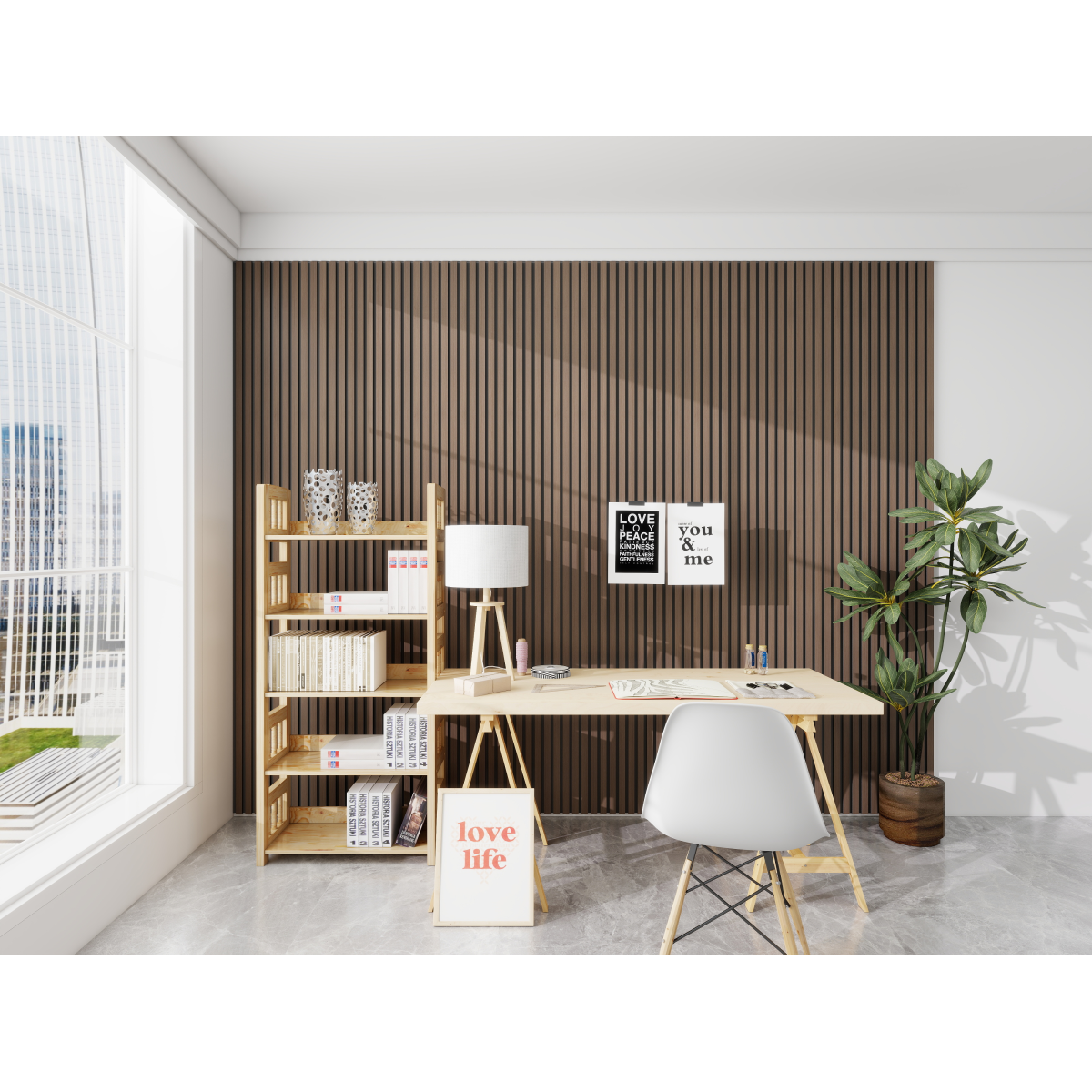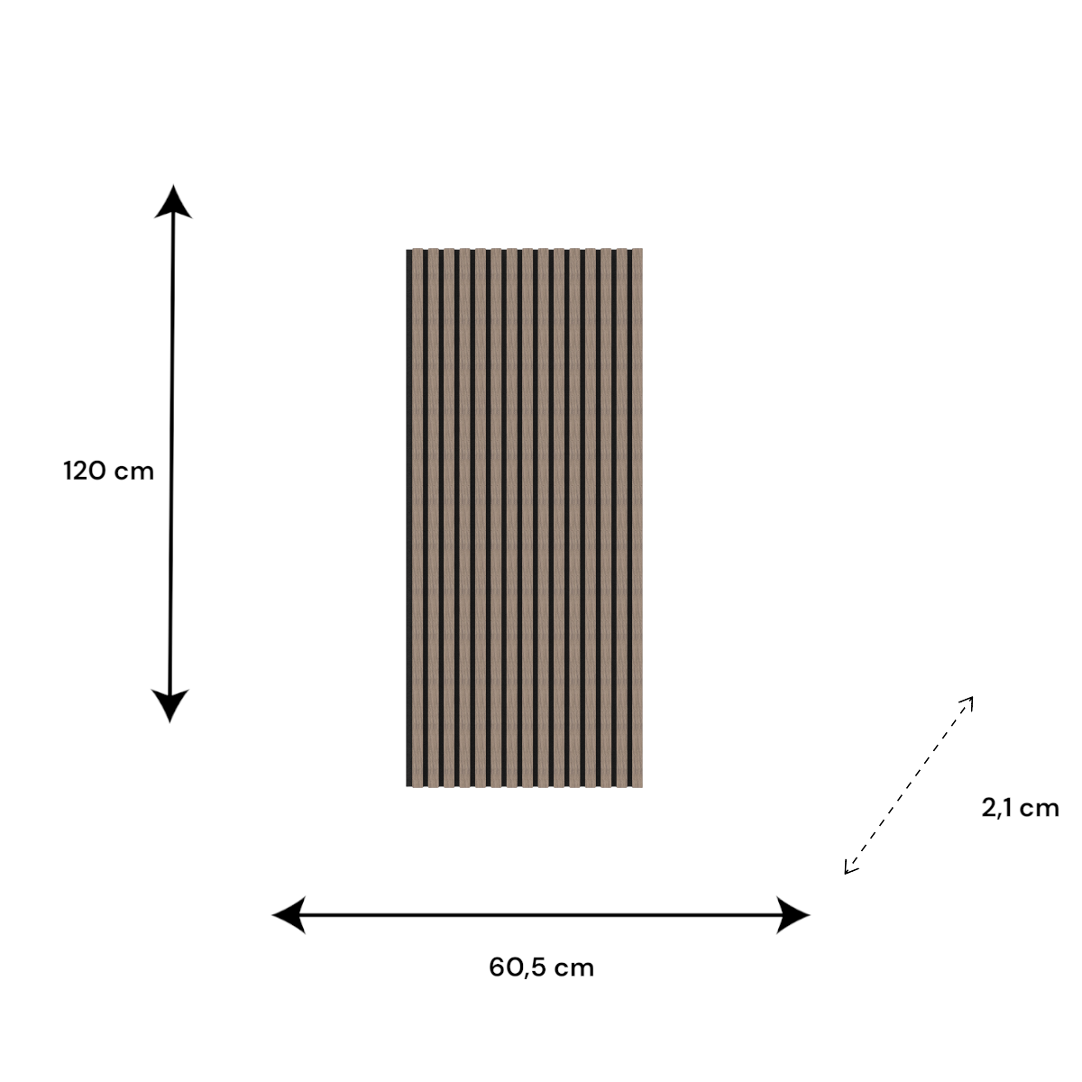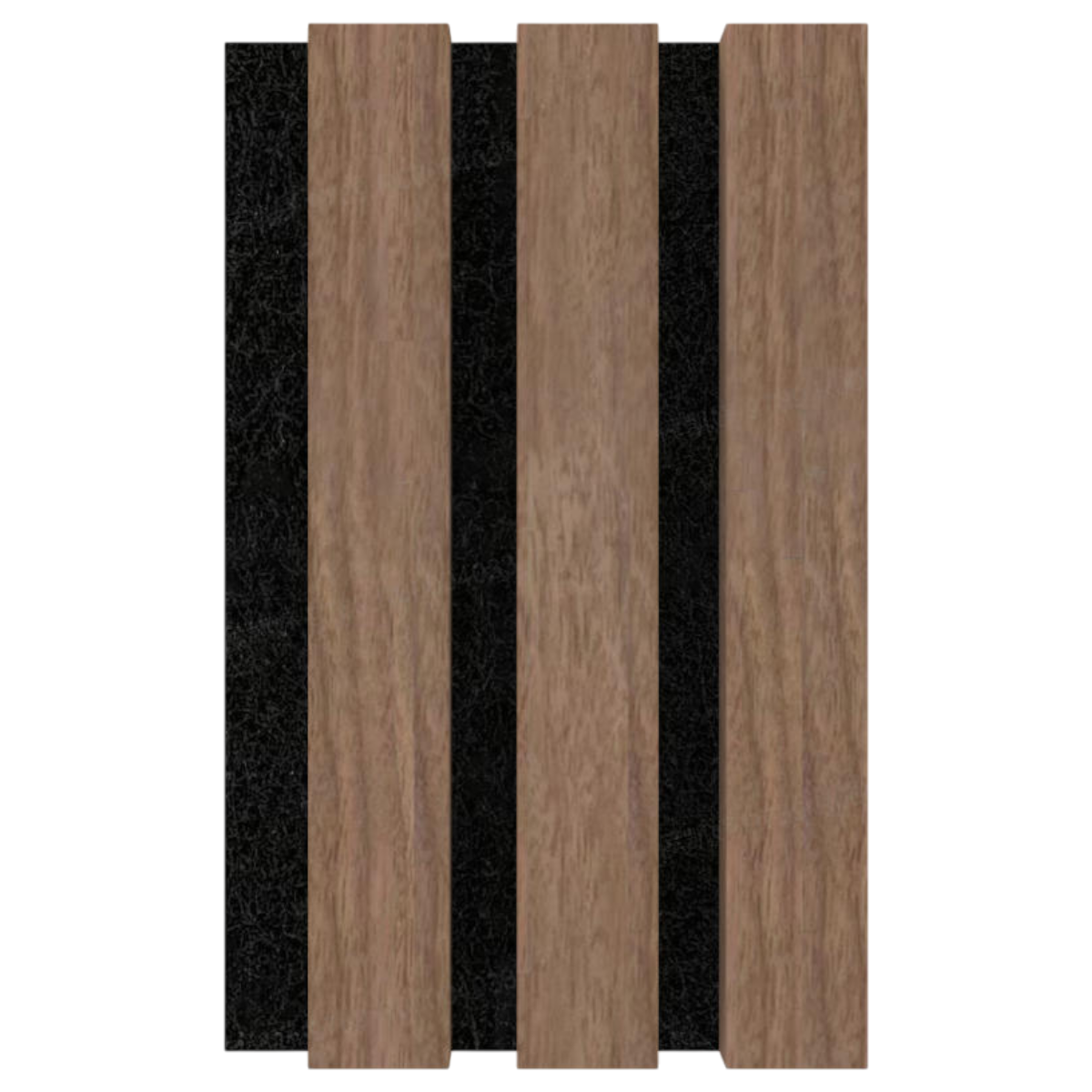 A 120 × 60,5 cm-es akusztikus falipanel dió színben modern és funkcionális megoldást kínál a belső terek hangkomfortjának javítására. A természetes hatású furnér lécek és a sötét PET filc alap elegáns megjelenést biztosítanak, miközben segítenek csökkenteni a visszhangot és javítani a helyiség akusztikáját.