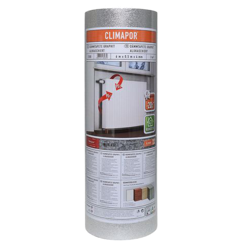 Hővisszaverő alumínium felületű radiátor szigetelő tapéta, ami a hő 95%-át visszaveri a helyiségbe, a beépített grafit alkatrészeknek köszönhetően nagyon hatékony, akár 20%-kal csökkenti a falon keresztüli hőveszteséget. Segíti a helyiségek gyorsabb felmelegedését, elfedi a repedéseket és egyenetlenségek a falfelületen.