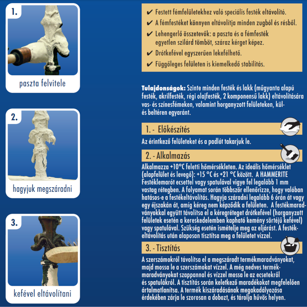 Paszta állagú, fehér színű festéklemaró 1 literes kiszerelésben. Alkalmas festékek, lakkok, műgyanta alapú festékek, akrilfestékek, régi olajfestékek és 2 komponensű lakkok eltávolítására. Alkalmazható vas- és színesfém, valamin horganyzott felületek megtisztításához.