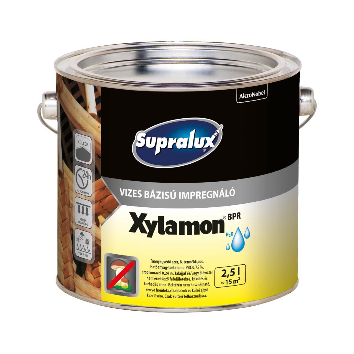 Vizes bázisú, használatra kész Supralux Xylamon impregnáló- és fakonzerváló szer védi a fát a gombákkal, kék elszíneződéssel, és a rovarkártevőkkel szemben. Kültéri fafelületek, pl. ablakok, kültéri ajtók, burkolatok, kerítések és ereszek kezelésére alkalmas. Kültéri használatra alkalmas, fokozza a lazúr tapadását a fafelülethez, védelmet nyújt az UV-sugárzással szemben. játékok, élelmiszerrel közvetlenül érintkező faanyagok bevonására nem alkalmas.