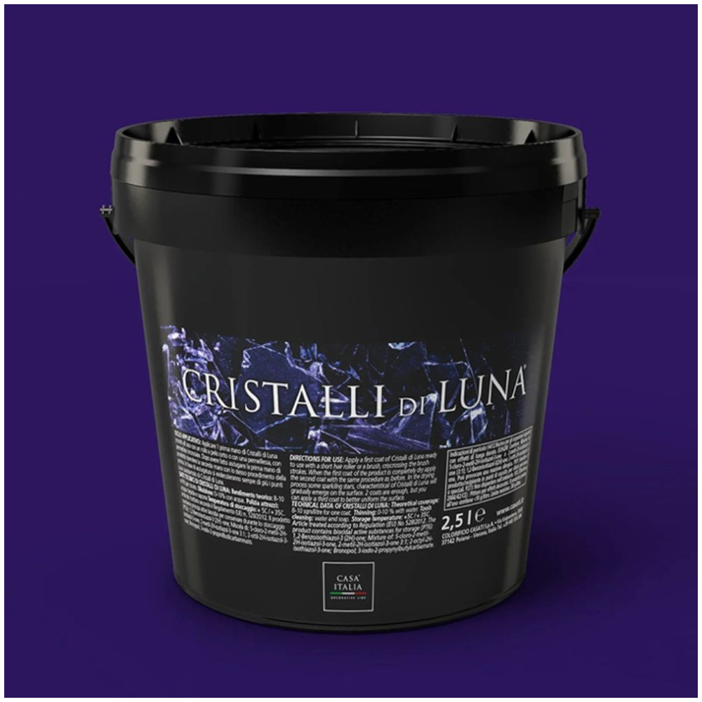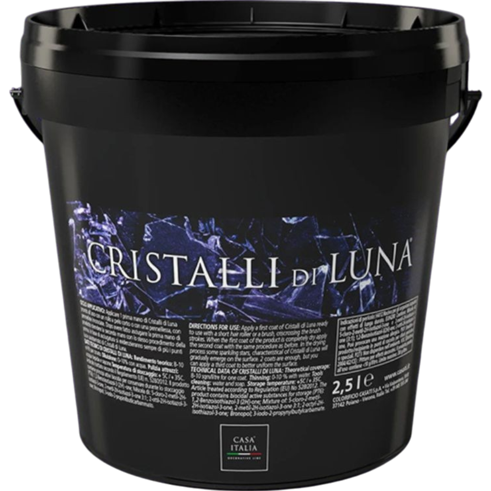 Cristalli Di Luna beltéri dekorációs festék. Apró kristályszemcse tartalmának köszönhetően elegáns, csillogó felületet varázsol otthonába. Az első réteg felhordása rövid szőrű hengerrel történik, majd a száradást követően a második réteg felhordásához ecsetet használjunk. 24-48 óra száradási idő elteltével a felületet száraz szivaccsal át kell dörzsölni, így kialakítva a végső csillámos felületet.A dekor festékkel festendő felület alapozása Decorfondo alapozóval 1-2 rétegben ajánlott.