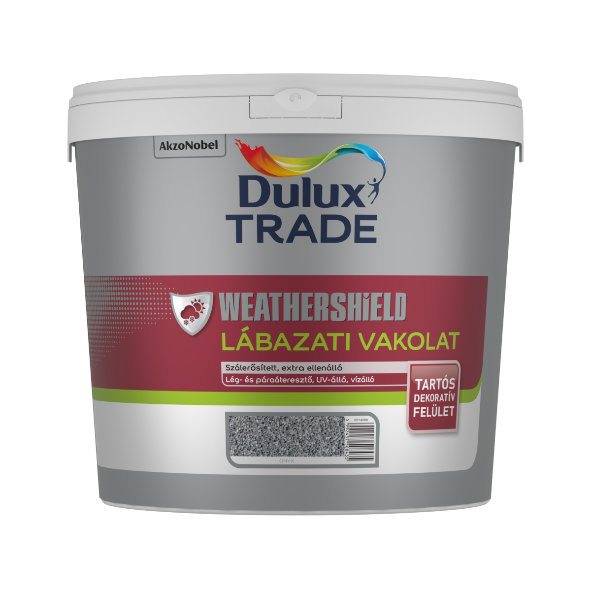 A Dulux Trade Weathershield Vakolat kiváló minőségű dekoratív bevonat homlokzatok és egyéb kültéri falfelületek díszítésére és védelmére. A szilikonadaléknak köszönhetően a termék feldolgozási tulajdonságai kiválóak, a kialakított felület sokáig megőrzi rugalmasságát. Megvédi a felületet a környezeti hatások (csapadék, pára, hőingadozás, UV sugárzás) károsító hatásaitól. A szálerősítés megnöveli a bevonat ellenállóképességét a mechanikai hatásokkal szemben, megelőzi a hajszál-repedések kialakulását. Alkalmazás Alkalmazható hőszigetelő rendszereken, hagyományos vakolatokon, beton és egyéb ásványi felületeken, valamint tapaszokon és szerves kötőanyagú simítótapaszokon. Hőszigetelő rendszerek esetén vegye figyelembe a rendszer gyártójának műszaki előírásait! Kérje szaktanácsadónk segítségét a már előzetesen díszítő vakolattal ellátott (pl. kőporos) falfelületek felújítása előtt. Gyermekektől elzárva tartandó.