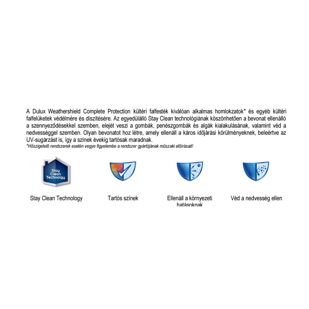 A Dulux Weathershield Complete Protection egy korszerű kültéri homlokzatfesték, amelyet úgy terveztek, hogy hosszabb távú védelmet és esztétikus, egységes felületet biztosítson. A Dulux Weathershield, karakteres színt ad az épület külső falainak, miközben a bevonat ellenáll a nedvességnek, algásodásnak, penészgombáknak és a szennyeződéseknek. A Stay Clean technológia segít megőrizni a felület tisztaságát, az UV-álló összetétel pedig hozzájárul ahhoz, hogy a színek évekig tartósabbak maradjanak.