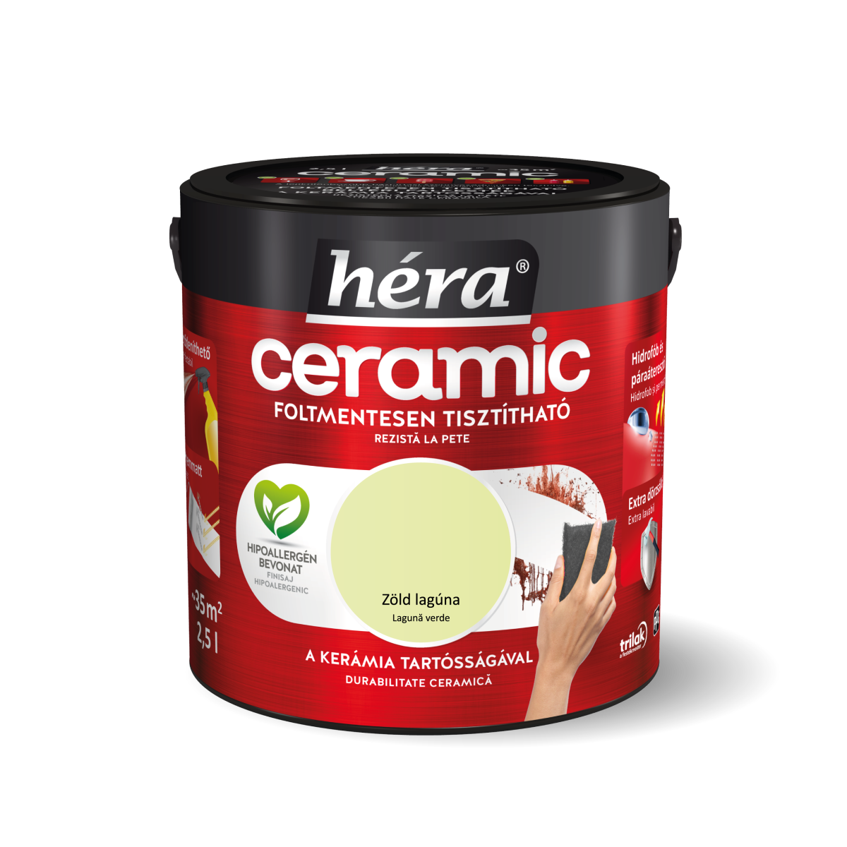 A Héra Ceramic „Zöld lagúna” beltéri falfesték üde, természetes árnyalatával és mosható, hipoallergén felületével tökéletes választás a friss, nyugodt és modern otthoni környezet megteremtéséhez.