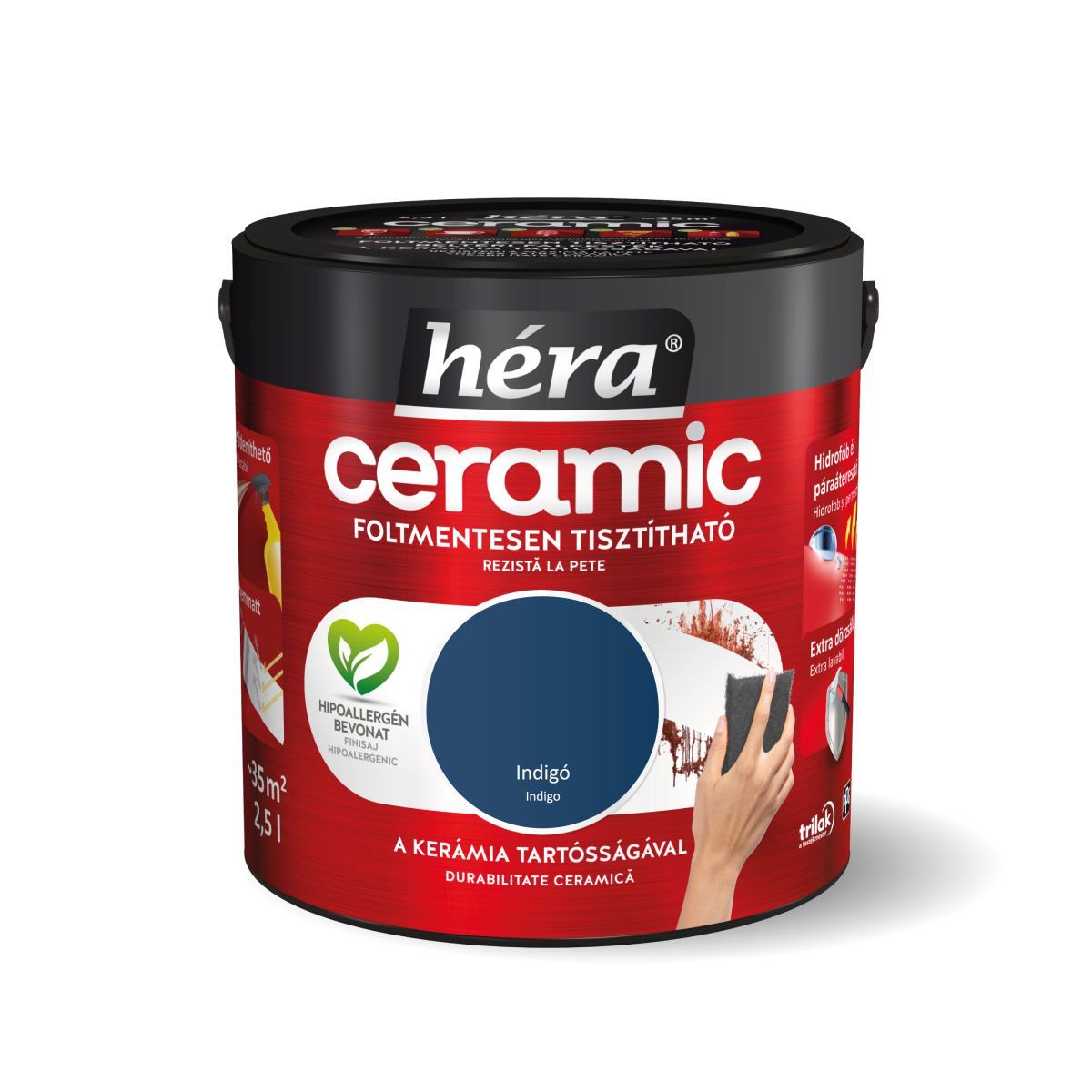 A Héra Ceramic „Indigó” beltéri falfesték mély, elegáns árnyalatával és mosható, hipoallergén felületével tökéletes választás a stílusos, karakteres otthoni terek kialakításához.