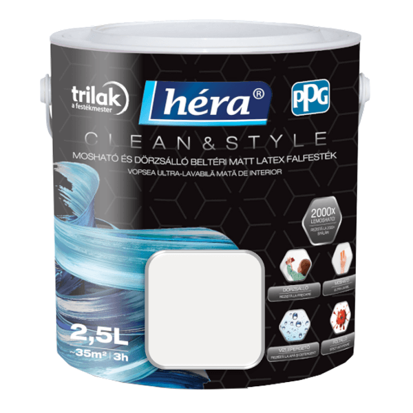 A Héra Clean & Style egy beltérben használható latex matt falfesték. Hibrid technológiájának köszönhetően mosható tisztítószerrel, dörzsálló és fertőtleníthető. Ellenálló és tartós, ugyanakkor pára- és légáteresztő bevonatot képez. Hidrofób alkotórészei révén a termék kiváló vízlepergető tulajdonságokkal rendelkezik. Kifejezetten alkalmas nagy igénybevételnek kitett helyiségek, például gyerekszobák, konyhák vagy fürdőszobák kifestéséhez. Egészségügyi intézményekben is alkalmazható. A festendő felület legyen száraz, hordképes, egyenletes szívóképességű, megfelelően alapozott. Felhordása ecsettel, hengerrel vagy szóróberendezéssel javasolt 2 rétegben, 3 óra elteltével átfesthető. Airless szóráshoz javasolt beállítások: fúvóka: 0,018” – 0,026”, nyomás: 150 - 180 bar, fúvókaszög: 50 fok, hígítás: 2% víz. A végleges, ellenálló filmréteg 4 hét elteltével alakul ki. A kép csak tájékoztató jellegű! A termék színei különbözhetnek a monitoron látottaktól. Színhelyes mintákért látogasson el áruházainkba, ahol személyesen válogathat változatos kínálatunkból.