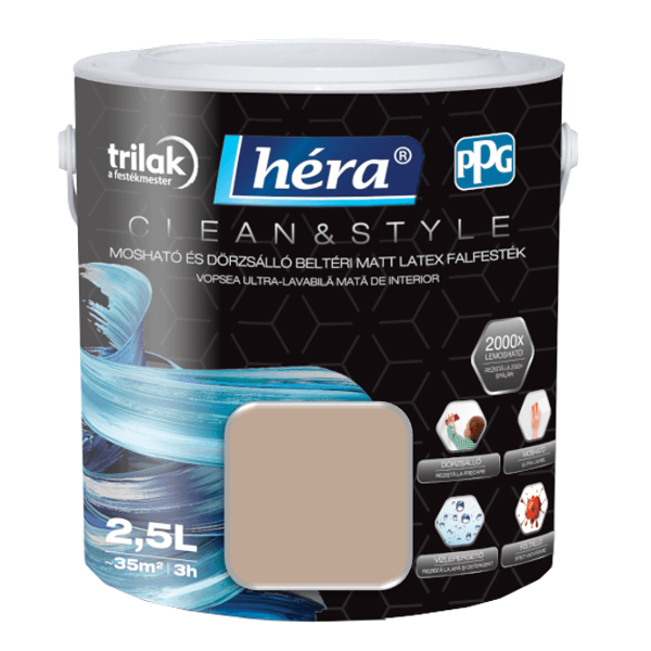 A Héra Clean & Style egy beltérben használható latex matt falfesték. Hibrid technológiájának köszönhetően mosható tisztítószerrel, dörzsálló és fertőtleníthető. Ellenálló és tartós, ugyanakkor pára- és légáteresztő bevonatot képez. Hidrofób alkotórészei révén a termék kiváló vízlepergető tulajdonságokkal rendelkezik. Kifejezetten alkalmas nagy igénybevételnek kitett helyiségek, például gyerekszobák, konyhák vagy fürdőszobák kifestéséhez. Egészségügyi intézményekben is alkalmazható. A festendő felület legyen száraz, hordképes, egyenletes szívóképességű, megfelelően alapozott. Felhordása ecsettel, hengerrel vagy szóróberendezéssel javasolt 2 rétegben, 3 óra elteltével átfesthető. Airless szóráshoz javasolt beállítások: fúvóka: 0,018” – 0,026”, nyomás: 150 - 180 bar, fúvókaszög: 50 fok, hígítás: 2% víz. A végleges, ellenálló filmréteg 4 hét elteltével alakul ki. A kép csak tájékoztató jellegű! A termék színei különbözhetnek a monitoron látottaktól. Színhelyes mintákért látogasson el áruházainkba, ahol személyesen válogathat változatos kínálatunkból.