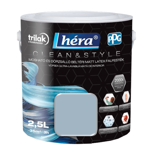 A Héra Clean & Style egy beltérben használható latex matt falfesték. Hibrid technológiájának köszönhetően mosható tisztítószerrel, dörzsálló és fertőtleníthető. Ellenálló és tartós, ugyanakkor pára- és légáteresztő bevonatot képez. Hidrofób alkotórészei révén a termék kiváló vízlepergető tulajdonságokkal rendelkezik. Kifejezetten alkalmas nagy igénybevételnek kitett helyiségek, például gyerekszobák, konyhák vagy fürdőszobák kifestéséhez. Egészségügyi intézményekben is alkalmazható. A festendő felület legyen száraz, hordképes, egyenletes szívóképességű, megfelelően alapozott. Felhordása ecsettel, hengerrel vagy szóróberendezéssel javasolt 2 rétegben, 3 óra elteltével átfesthető. Airless szóráshoz javasolt beállítások: fúvóka: 0,018” – 0,026”, nyomás: 150 - 180 bar, fúvókaszög: 50 fok, hígítás: 2% víz. A végleges, ellenálló filmréteg 4 hét elteltével alakul ki. A kép csak tájékoztató jellegű! A termék színei különbözhetnek a monitoron látottaktól. Színhelyes mintákért látogasson el áruházainkba, ahol személyesen válogathat változatos kínálatunkból.