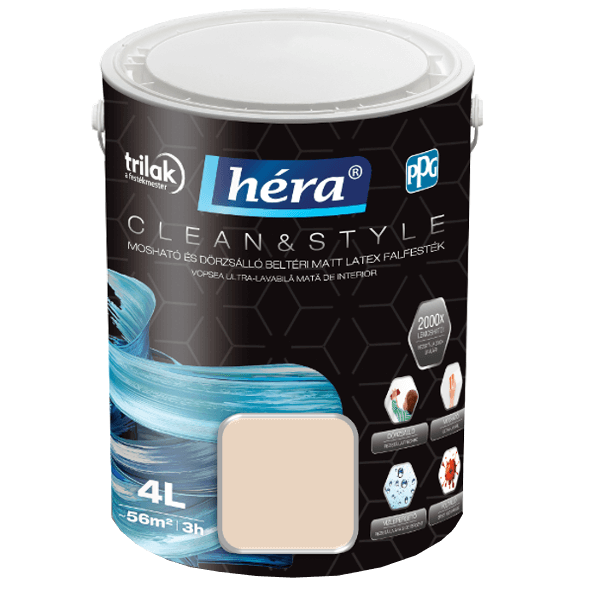 A Héra Clean & Style egy beltérben használható latex matt falfesték. Hibrid technológiájának köszönhetően mosható tisztítószerrel, dörzsálló és fertőtleníthető. Ellenálló és tartós, ugyanakkor pára- és légáteresztő bevonatot képez. Hidrofób alkotórészei révén a termék kiváló vízlepergető tulajdonságokkal rendelkezik. Kifejezetten alkalmas nagy igénybevételnek kitett helyiségek, például gyerekszobák, konyhák vagy fürdőszobák kifestéséhez. Egészségügyi intézményekben is alkalmazható. A festendő felület legyen száraz, hordképes, egyenletes szívóképességű, megfelelően alapozott. Felhordása ecsettel, hengerrel vagy szóróberendezéssel javasolt 2 rétegben, 3 óra elteltével átfesthető. Airless szóráshoz javasolt beállítások: fúvóka: 0,018” – 0,026”, nyomás: 150 - 180 bar, fúvókaszög: 50 fok, hígítás: 2% víz. A végleges, ellenálló filmréteg 4 hét elteltével alakul ki. A kép csak tájékoztató jellegű! A termék színei különbözhetnek a monitoron látottaktól. Színhelyes mintákért látogasson el áruházainkba, ahol személyesen válogathat változatos kínálatunkból.