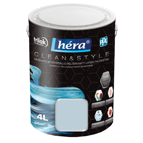 A Héra Clean & Style egy beltérben használható latex matt falfesték. Hibrid technológiájának köszönhetően mosható tisztítószerrel, dörzsálló és fertőtleníthető. Ellenálló és tartós, ugyanakkor pára- és légáteresztő bevonatot képez. Hidrofób alkotórészei révén a termék kiváló vízlepergető tulajdonságokkal rendelkezik. Kifejezetten alkalmas nagy igénybevételnek kitett helyiségek, például gyerekszobák, konyhák vagy fürdőszobák kifestéséhez. Egészségügyi intézményekben is alkalmazható. A festendő felület legyen száraz, hordképes, egyenletes szívóképességű, megfelelően alapozott. Felhordása ecsettel, hengerrel vagy szóróberendezéssel javasolt 2 rétegben, 3 óra elteltével átfesthető. Airless szóráshoz javasolt beállítások: fúvóka: 0,018” – 0,026”, nyomás: 150 - 180 bar, fúvókaszög: 50 fok, hígítás: 2% víz. A végleges, ellenálló filmréteg 4 hét elteltével alakul ki. A kép csak tájékoztató jellegű! A termék színei különbözhetnek a monitoron látottaktól. Színhelyes mintákért látogasson el áruházainkba, ahol személyesen válogathat változatos kínálatunkból.