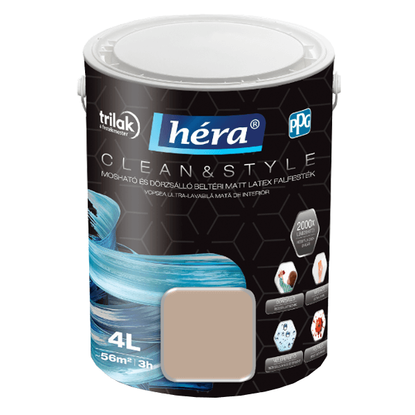 A Héra Clean & Style egy beltérben használható latex matt falfesték. Hibrid technológiájának köszönhetően mosható tisztítószerrel, dörzsálló és fertőtleníthető. Ellenálló és tartós, ugyanakkor pára- és légáteresztő bevonatot képez. Hidrofób alkotórészei révén a termék kiváló vízlepergető tulajdonságokkal rendelkezik. Kifejezetten alkalmas nagy igénybevételnek kitett helyiségek, például gyerekszobák, konyhák vagy fürdőszobák kifestéséhez. Egészségügyi intézményekben is alkalmazható. A festendő felület legyen száraz, hordképes, egyenletes szívóképességű, megfelelően alapozott. Felhordása ecsettel, hengerrel vagy szóróberendezéssel javasolt 2 rétegben, 3 óra elteltével átfesthető. Airless szóráshoz javasolt beállítások: fúvóka: 0,018” – 0,026”, nyomás: 150 - 180 bar, fúvókaszög: 50 fok, hígítás: 2% víz. A végleges, ellenálló filmréteg 4 hét elteltével alakul ki. A kép csak tájékoztató jellegű! A termék színei különbözhetnek a monitoron látottaktól. Színhelyes mintákért látogasson el áruházainkba, ahol személyesen válogathat változatos kínálatunkból.