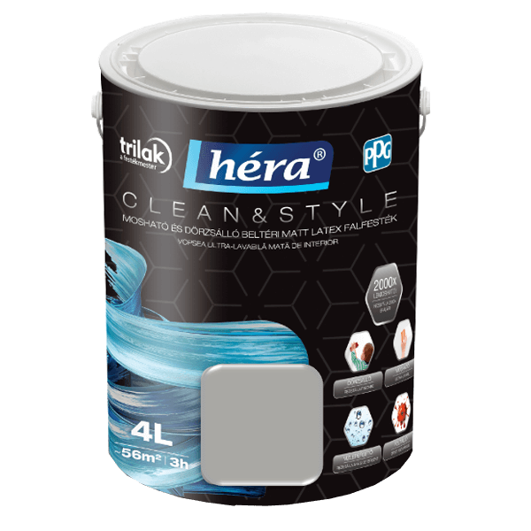 A Héra Clean & Style egy beltérben használható latex matt falfesték. Hibrid technológiájának köszönhetően mosható tisztítószerrel, dörzsálló és fertőtleníthető. Ellenálló és tartós, ugyanakkor pára- és légáteresztő bevonatot képez. Hidrofób alkotórészei révén a termék kiváló vízlepergető tulajdonságokkal rendelkezik. Kifejezetten alkalmas nagy igénybevételnek kitett helyiségek, például gyerekszobák, konyhák vagy fürdőszobák kifestéséhez. Egészségügyi intézményekben is alkalmazható. A festendő felület legyen száraz, hordképes, egyenletes szívóképességű, megfelelően alapozott. Felhordása ecsettel, hengerrel vagy szóróberendezéssel javasolt 2 rétegben, 3 óra elteltével átfesthető. Airless szóráshoz javasolt beállítások: fúvóka: 0,018” – 0,026”, nyomás: 150 - 180 bar, fúvókaszög: 50 fok, hígítás: 2% víz. A végleges, ellenálló filmréteg 4 hét elteltével alakul ki. A kép csak tájékoztató jellegű! A termék színei különbözhetnek a monitoron látottaktól. Színhelyes mintákért látogasson el áruházainkba, ahol személyesen válogathat változatos kínálatunkból.