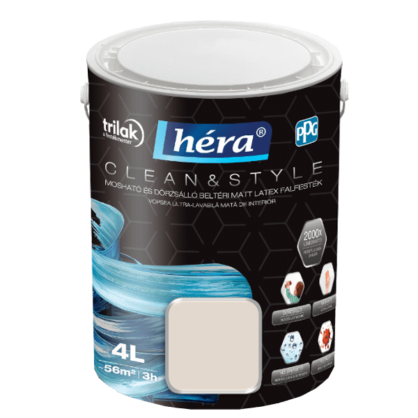 A Héra Clean & Style egy beltérben használható latex matt falfesték. Hibrid technológiájának köszönhetően mosható tisztítószerrel, dörzsálló és fertőtleníthető. Ellenálló és tartós, ugyanakkor pára- és légáteresztő bevonatot képez. Hidrofób alkotórészei révén a termék kiváló vízlepergető tulajdonságokkal rendelkezik. Kifejezetten alkalmas nagy igénybevételnek kitett helyiségek, például gyerekszobák, konyhák vagy fürdőszobák kifestéséhez. Egészségügyi intézményekben is alkalmazható. A festendő felület legyen száraz, hordképes, egyenletes szívóképességű, megfelelően alapozott. Felhordása ecsettel, hengerrel vagy szóróberendezéssel javasolt 2 rétegben, 3 óra elteltével átfesthető. Airless szóráshoz javasolt beállítások: fúvóka: 0,018” – 0,026”, nyomás: 150 - 180 bar, fúvókaszög: 50 fok, hígítás: 2% víz. A végleges, ellenálló filmréteg 4 hét elteltével alakul ki. A kép csak tájékoztató jellegű! A termék színei különbözhetnek a monitoron látottaktól. Színhelyes mintákért látogasson el áruházainkba, ahol személyesen válogathat változatos kínálatunkból.