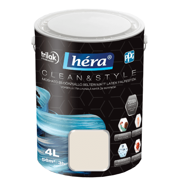A Héra Clean & Style egy beltérben használható latex matt falfesték. Hibrid technológiájának köszönhetően mosható tisztítószerrel, dörzsálló és fertőtleníthető. Ellenálló és tartós, ugyanakkor pára- és légáteresztő bevonatot képez. Hidrofób alkotórészei révén a termék kiváló vízlepergető tulajdonságokkal rendelkezik. Kifejezetten alkalmas nagy igénybevételnek kitett helyiségek, például gyerekszobák, konyhák vagy fürdőszobák kifestéséhez. Egészségügyi intézményekben is alkalmazható. A festendő felület legyen száraz, hordképes, egyenletes szívóképességű, megfelelően alapozott. Felhordása ecsettel, hengerrel vagy szóróberendezéssel javasolt 2 rétegben, 3 óra elteltével átfesthető. Airless szóráshoz javasolt beállítások: fúvóka: 0,018” – 0,026”, nyomás: 150 - 180 bar, fúvókaszög: 50 fok, hígítás: 2% víz. A végleges, ellenálló filmréteg 4 hét elteltével alakul ki. A kép csak tájékoztató jellegű! A termék színei különbözhetnek a monitoron látottaktól. Színhelyes mintákért látogasson el áruházainkba, ahol személyesen válogathat változatos kínálatunkból.