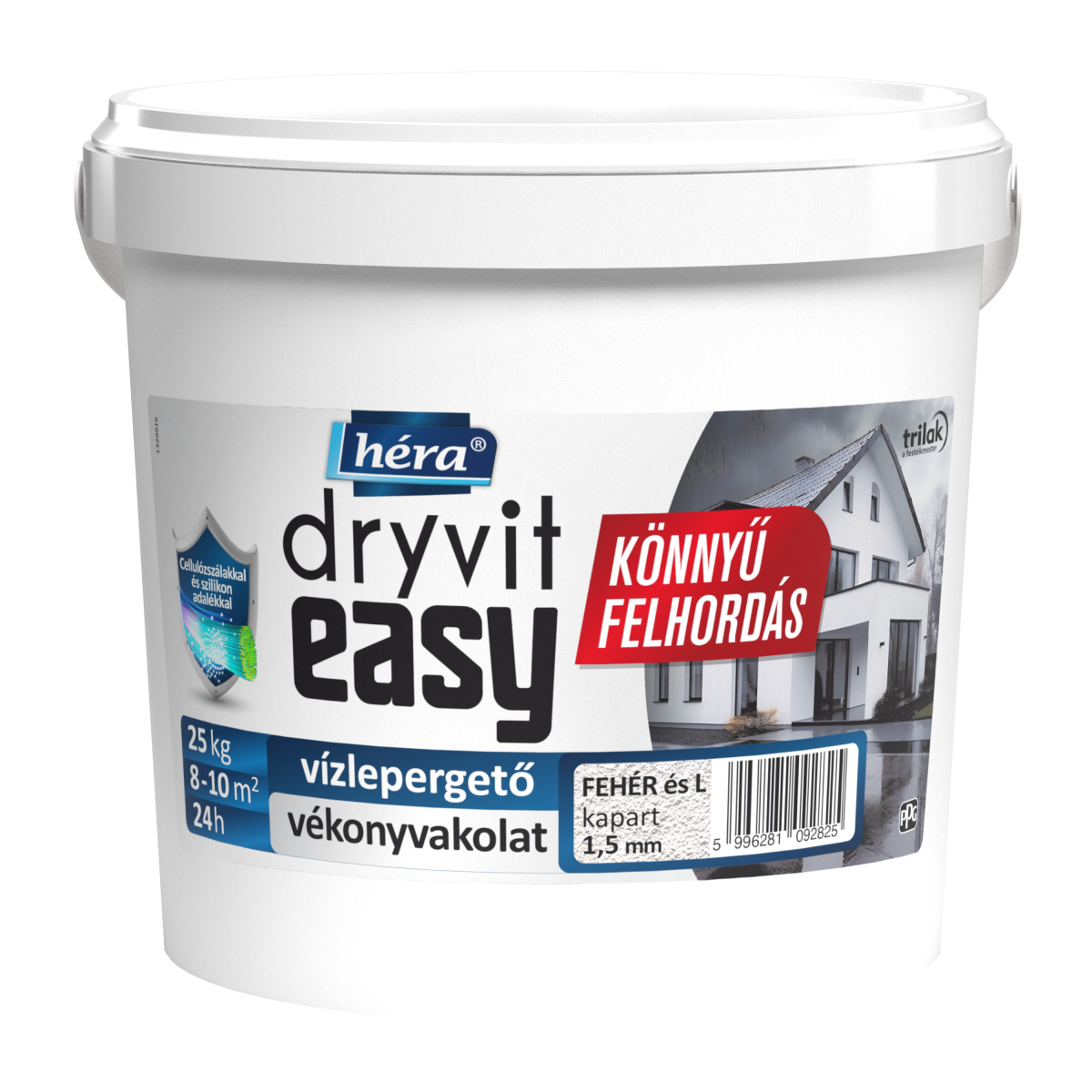 A Héra Dryvit Easy egy prémium minőségű, diszperziós kötőanyagú, vízlepergető vékonyvakolat, amely 1,5 mm kapart struktúrában érhető el.