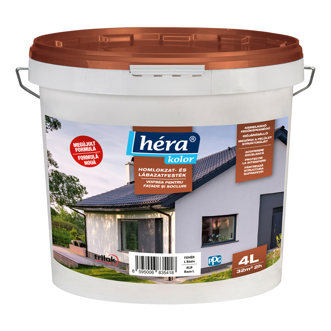 A Héra homlokzat- és lábazatfesték matt, vékony rétegű bevonatot képez, amely ideális vakolt és beton felületek – köztük homlokzatok és lábazatok – festésére.