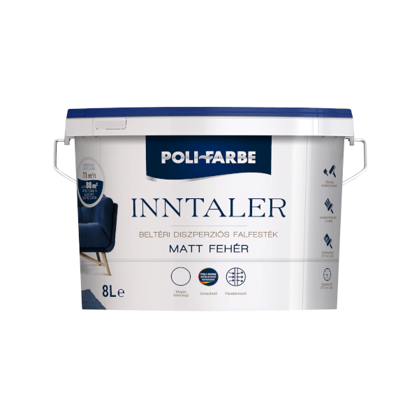 Inntaler beltéri falfesték. Különleges minőségű, extra fehérségű, oldószermentes, jól színezhető, illatosított, vízzel hígítható falfesték. Bevonata matt, tartós, esztétikus, jó pára- és légáteresztő, mosásálló. Kiadósság: 11 m2/liter 1 rétegben, erősen függ a felület minőségétől. Hígítás: első rétegben max. 20% vízzel, második és 3. rétegben 5% vízzel. Javasolt rétegszám: 2-3 réteg. Több kiszerelésben elérhető: 2L, 4L, 8L, 15L.