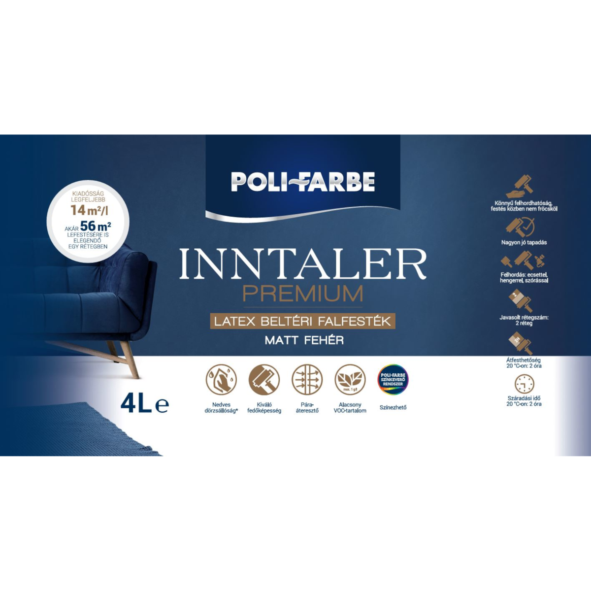 A Poli-Farbe Inntaler Premium Latex beltéri falfesték ideális választás, ha esztétikus, matt hatású és légáteresztő bevonatot szeretnél otthonod falaira. Kiváló fedőképességének és extra alacsony VOC-tartalmának köszönhetően biztonságosan használható lakott helyiségekben is, miközben kellemes illata megkönnyíti a munkát. A festék vízzel hígítható, színezhető, és jó páraáteresztő képességével segíti a fal természetes szellőzését, így csökkenti a penészedés kockázatát.
