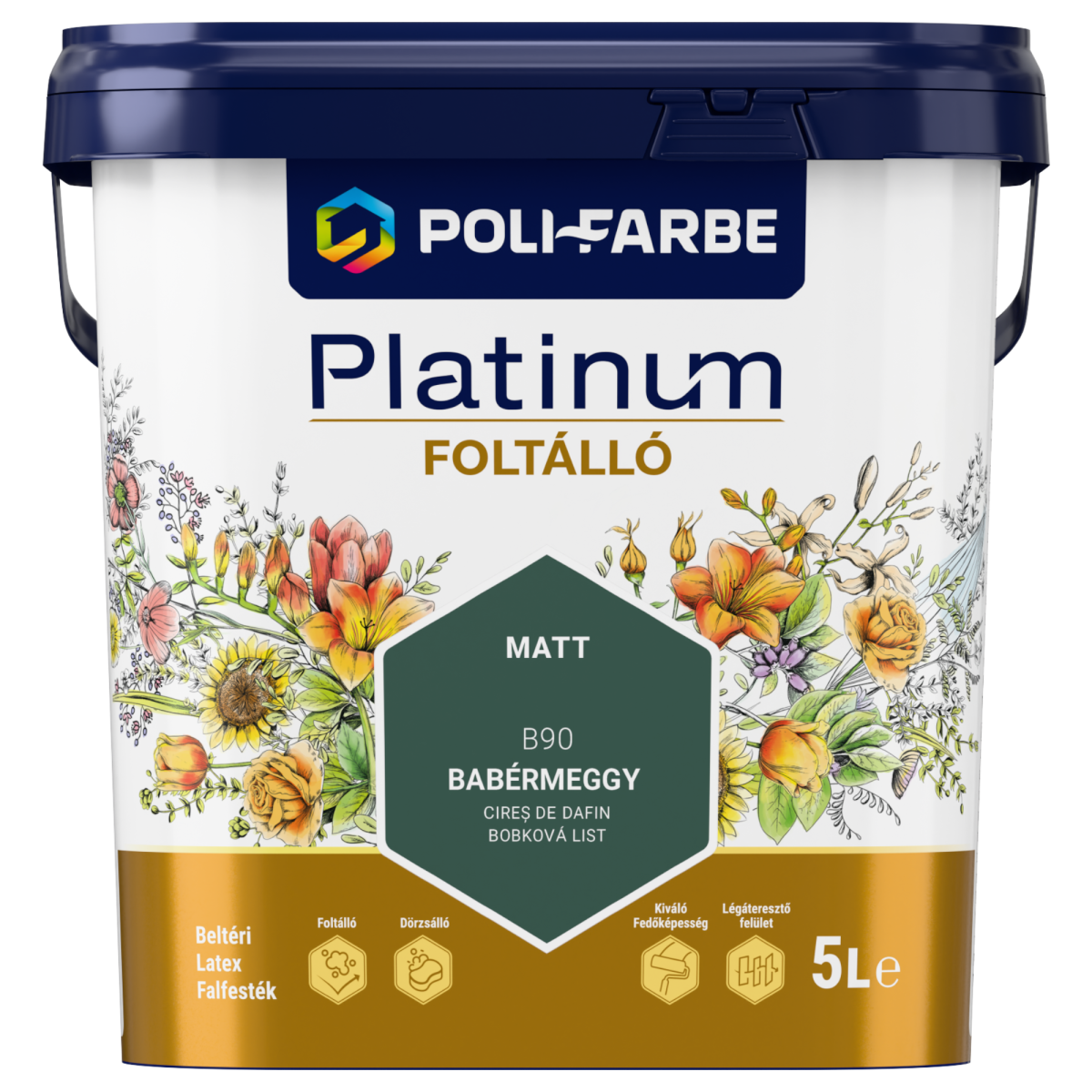A Poli-Farbe Platinum B90 Babérmeggy foltálló falfesték ideális választás, ha tartós, dörzsálló és elegáns megoldást keresel otthonod belső falainak dekorálásához – professzionális minőség, kompromisszummentes színhatás.