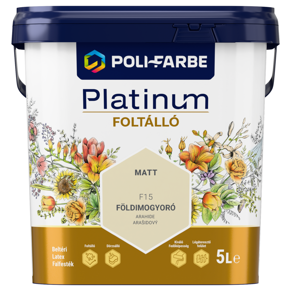 A Poli-Farbe Platinum F15 Földimogyoró falfesték természetes hatású, könnyen tisztítható megoldás, amely hosszú távon is esztétikus és kiegyensúlyozott megjelenést biztosít otthonodban.