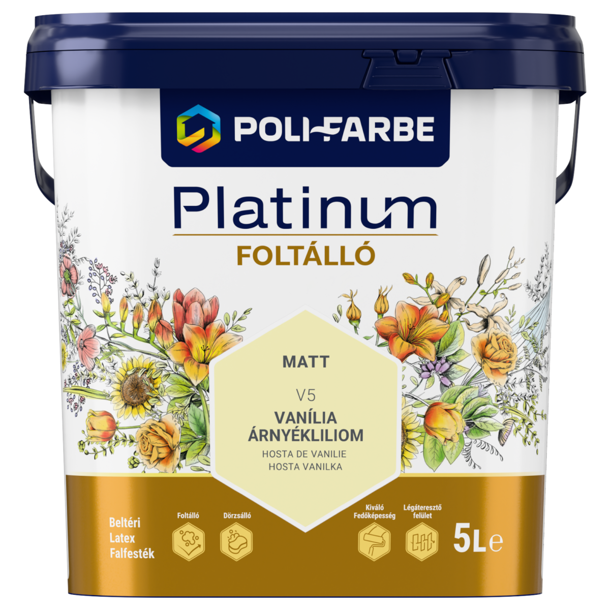 A Poli-Farbe Platinum V5 Vanília árnyékliliom falfesték elegáns, foltálló bevonatot ad, amely egyszerre tartós, higiénikus és otthonos megjelenést kölcsönöz bármely beltéri térnek.