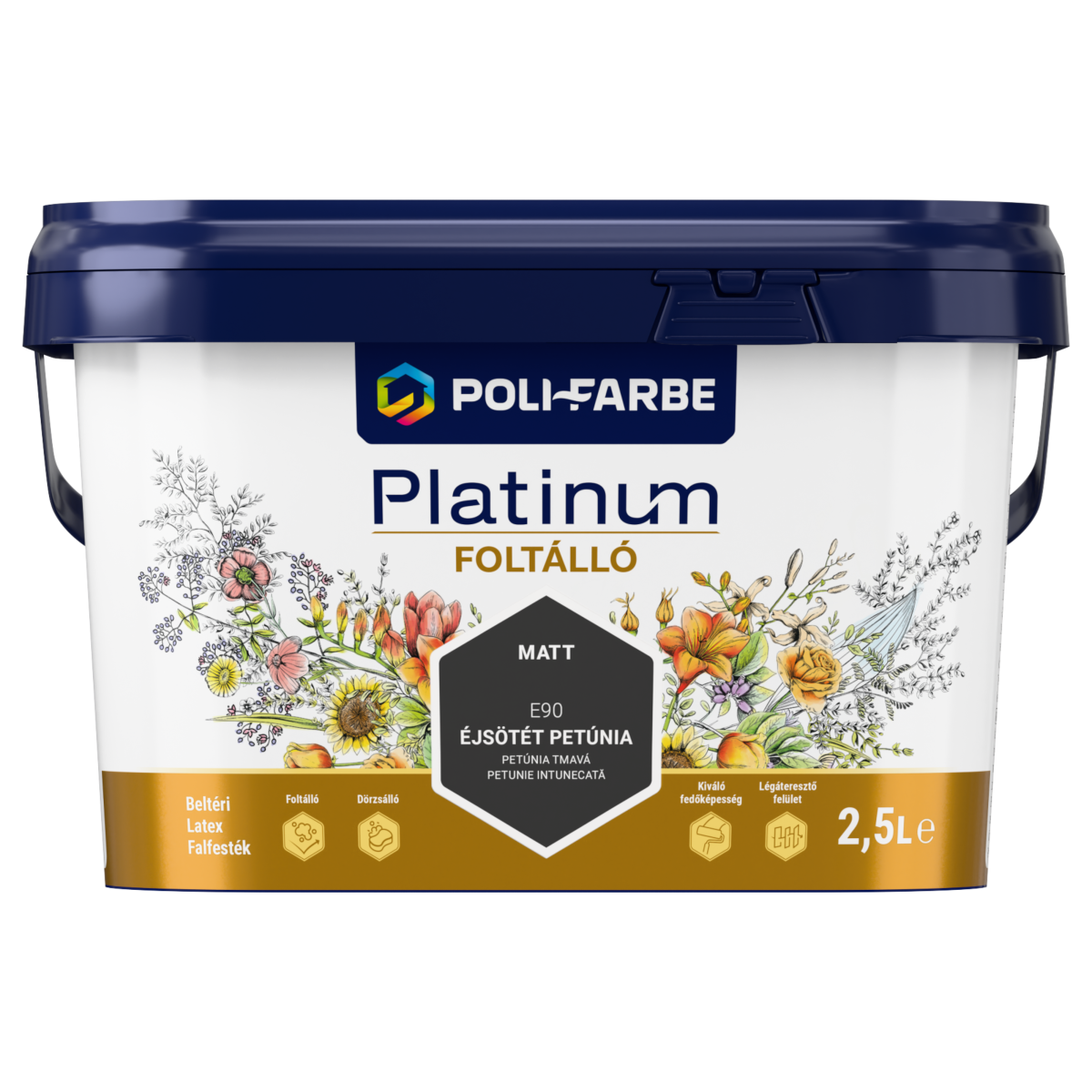 A Poli-Farbe Platinum foltálló beltéri falfesték ideális választás, ha elegáns, mély árnyalattal szeretnéd karakteressé tenni otthonod falait. Az E90 Éjsötét petúnia szín intenzív, sötét tónusa modern és kifinomult megjelenést biztosít, amely különösen jól érvényesül világos bútorok és kiegészítők mellett. A foltálló latex formula dörzsálló, mosható és légáteresztő bevonatot képez, így a fal hosszú távon is megőrzi tiszta, ápolt hatását.