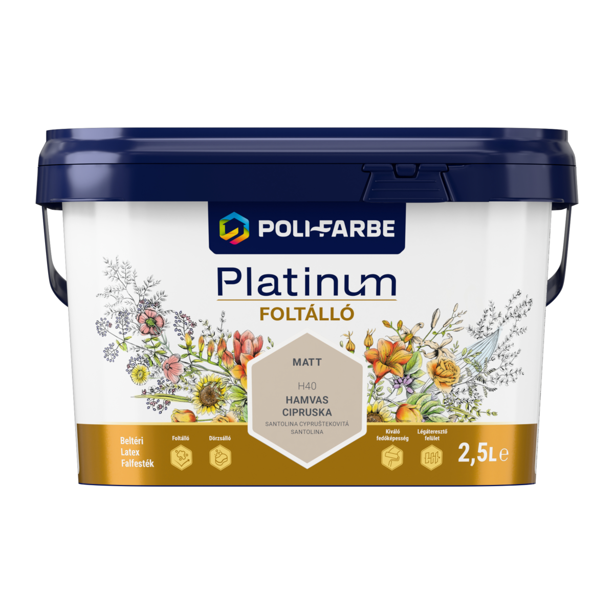 A Poli-Farbe Platinum H40 Hamvas cipruska falfesték tökéletes választás, ha természetes, elegáns színt és tartós, könnyen tisztítható felületet szeretnél otthonod falaira.
