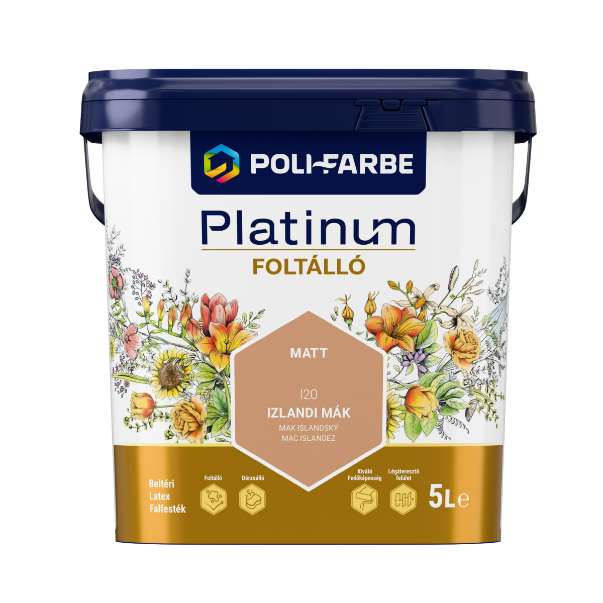 A Poli-Farbe Platinum foltálló beltéri falfesték magas minőségű, latex alapú festék, amely tartós, légáteresztő és könnyen tisztítható bevonatot képez. Az I20 Izlandi mák árnyalat friss, világos tónusaival tágasabbá és világosabbá teszi a helyiségeket, miközben természetes harmóniát kölcsönöz a térnek. Kiváló fedőképességének és dörzsállóságának köszönhetően hosszú távon megőrzi a falak rendezett, ápolt megjelenését.