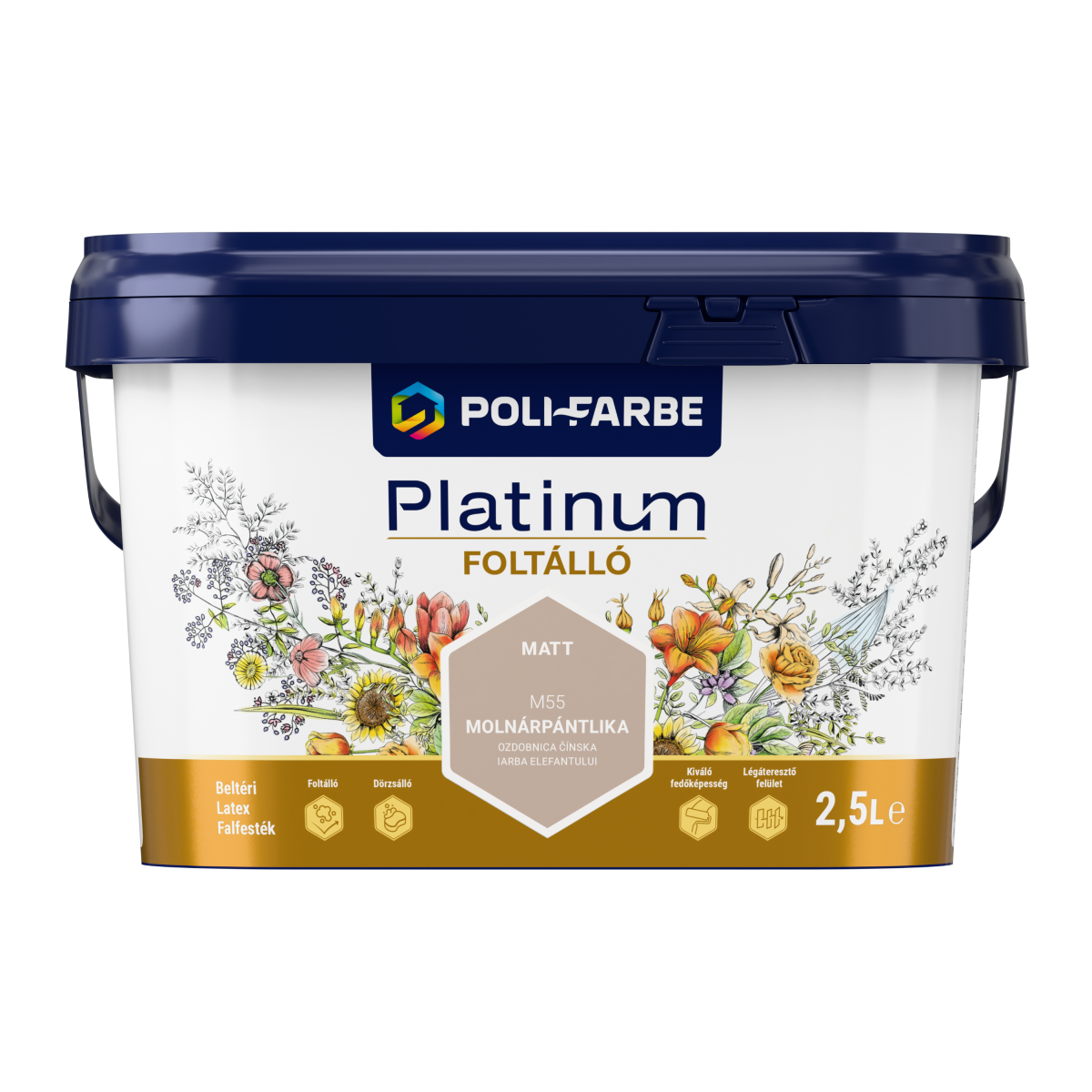 A Poli-Farbe Platinum foltálló beltéri falfesték elegáns, karakteres színeivel új szintre emeli az otthoni falfelületek megjelenését. Az M55 Molnárpántlika árnyalat különleges, mély rózsaszínes-lilás tónusa modern és romantikus hatást kölcsönöz a térnek, miközben a falakat ellenállóbbá teszi a mindennapi igénybevétellel szemben. A latex alapú, foltálló festék dörzsálló, mosható és légáteresztő, így a fal hosszú ideig tiszta, ápolt és friss marad.