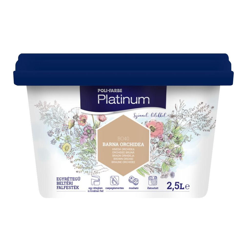 A Poli-Farbe Platinum színes beltéri falfesték „Barna orchidea” árnyalata meleg, karakteres tónus, amely eleganciát és természetes harmóniát visz a belső terekbe.