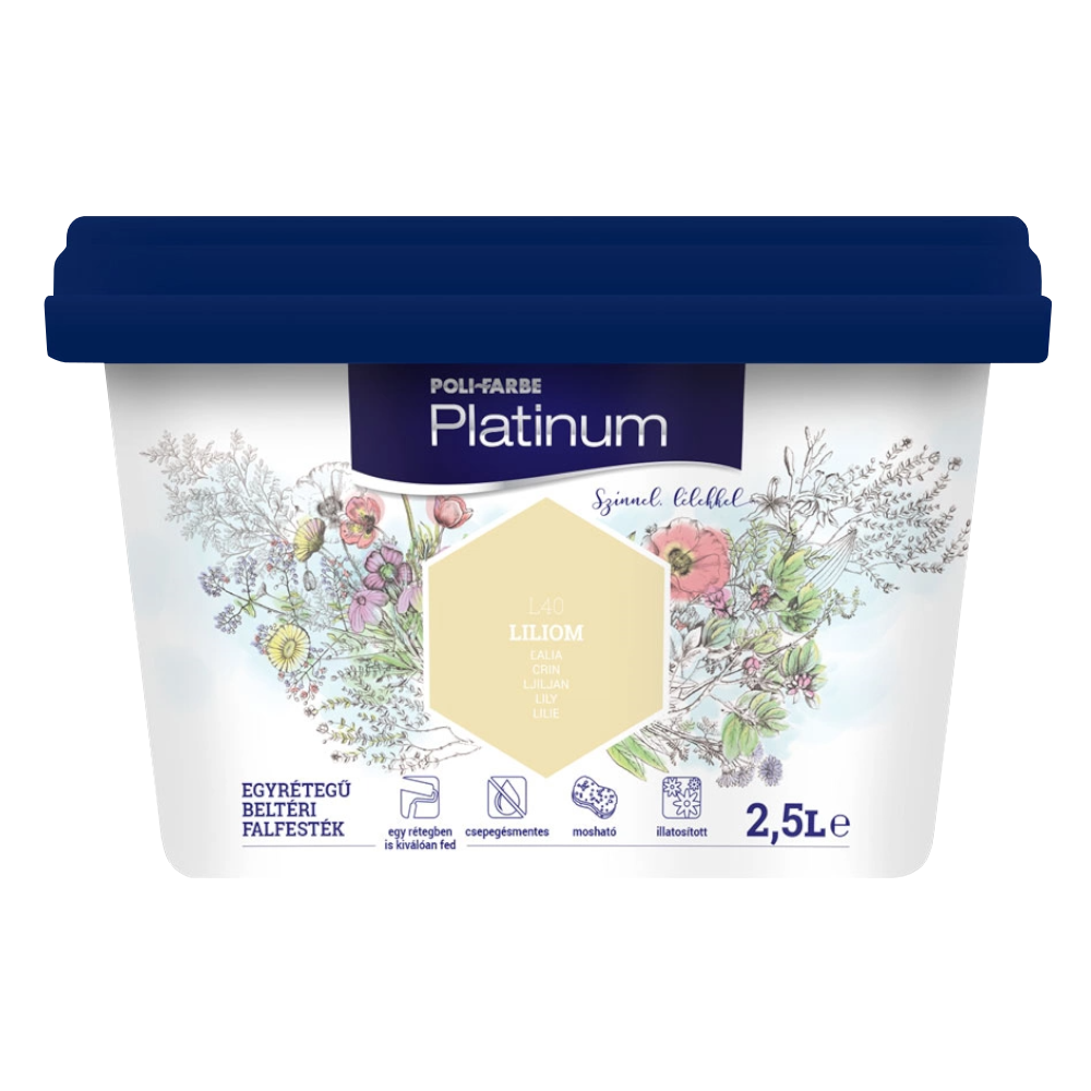 A Poli-Farbe Platinum színes beltéri falfesték „Liliom” árnyalata elegáns, lágy tónusával természetes és barátságos hangulatot teremt otthonodban.