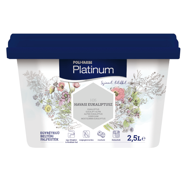 A Poli-Farbe Platinum színes falfesték „Havasi eukaliptusz” árnyalata friss, zöldes tónusával üde, természetközeli atmoszférát teremt otthonodban. A vizes bázisú, gélesített és csepegésmentes összetétel könnyen kezelhető, miközben a matt, mosható bevonat tartósabb és esztétikusabb megjelenést biztosít a falaknak. Ideális választás mindazoknak, akik a modern letisztultságot természetes árnyalatokkal szeretnék ötvözni.