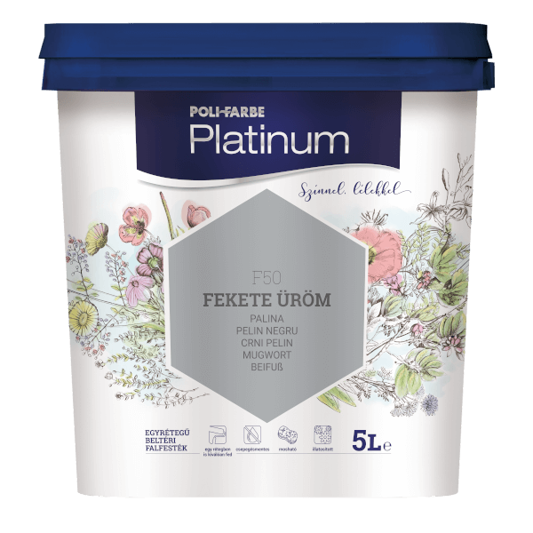 A Poli-Farbe Platinum színes falfesték „Fekete üröm” árnyalata karakteres, modern szürke tónus, amely elegáns kontrasztot teremt a világosabb falszínekkel és bútorokkal. Ideális választás, ha otthonodba markáns, letisztult megjelenést szeretnél vinni. A gélesített, csepegésmentes állag megkönnyíti a felvitelt, míg a matt, tartós bevonat hosszú távon is esztétikus marad. A vízbázisú összetételnek köszönhetően a festék alacsony szagú, így lakott helyiségekben is kényelmesen használható.
