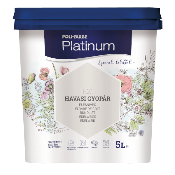 A Poli-Farbe Platinum színes falfesték „Havasi gyopár” árnyalata letisztult, lágy tónusú szín, amely frissességet és természetes eleganciát visz a belső terekbe. A gélesített, csepegésmentes állag kényelmes és tiszta munkavégzést tesz lehetővé, miközben a festék nagy fedőképessége és matt, egyenletes bevonata időtálló megoldást kínál. Vízbázisú, illatmentes formulája révén lakott helyiségekben is könnyedén alkalmazható.